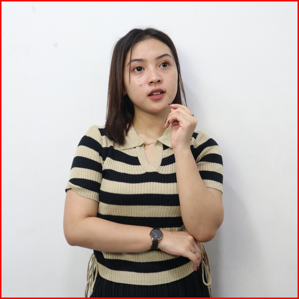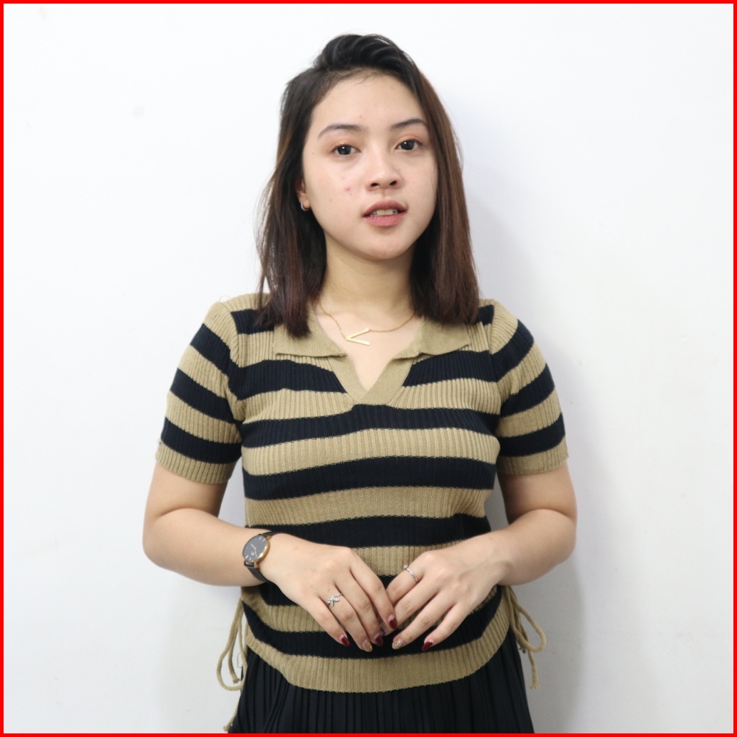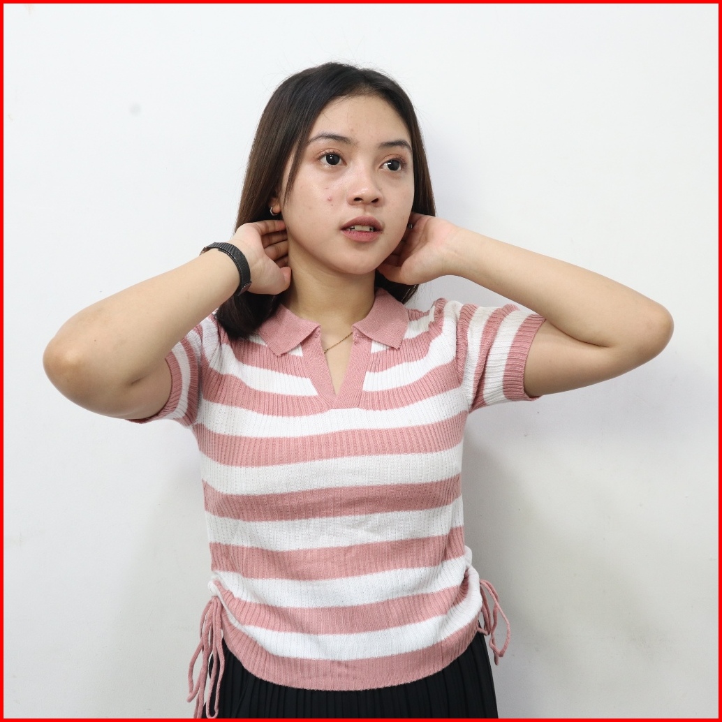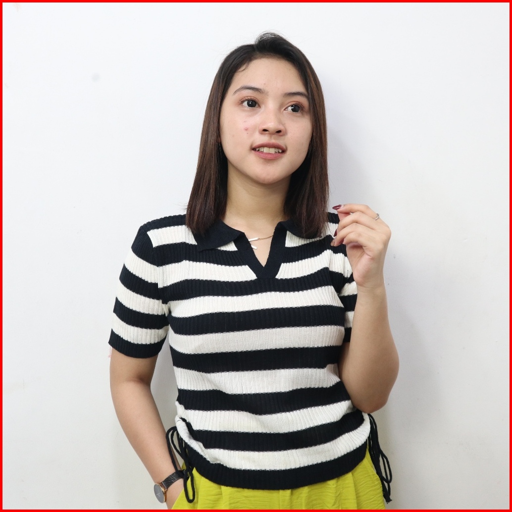 Kaos Kerah Tali Serut Polo Rajut Wanita Salur Polo Shirt Wanita Kaos Berkerah Wanita Style Korea