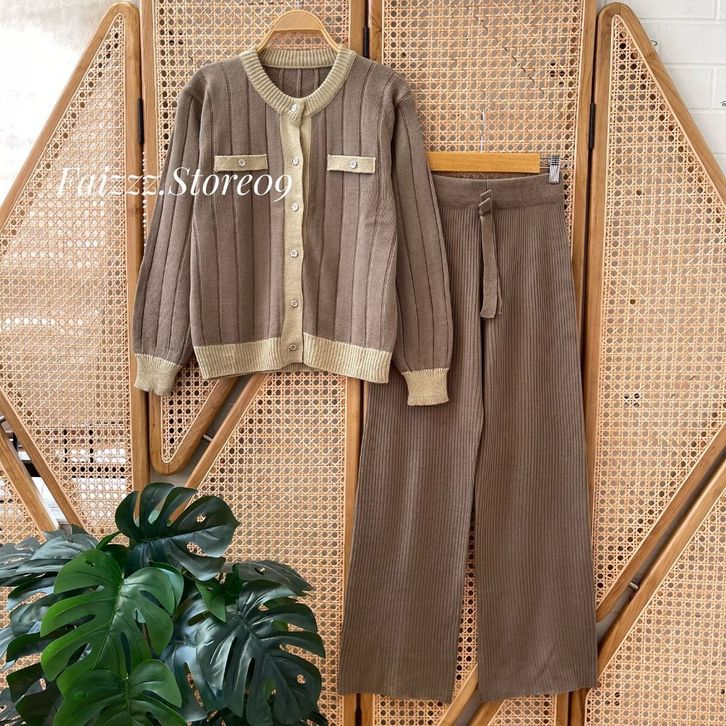 ONESET AMISHA CARDIGAN RAJUT STRIPE LENGAN PANJANG SETELAN CELANA KULOT WANITA PREMIUM KEKINIAN PAKAIAN WANITA SET