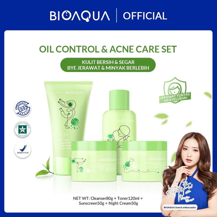 READY BIOAQUA 4PCS SKINCARE PAKET TEA TREE OLIGOPEPTIDE ACNE SET WITH CLEANSER TONER SUNSCREEN NIGHT CREAM MURAH ORIGINA