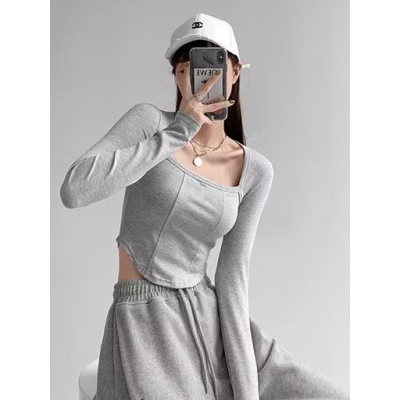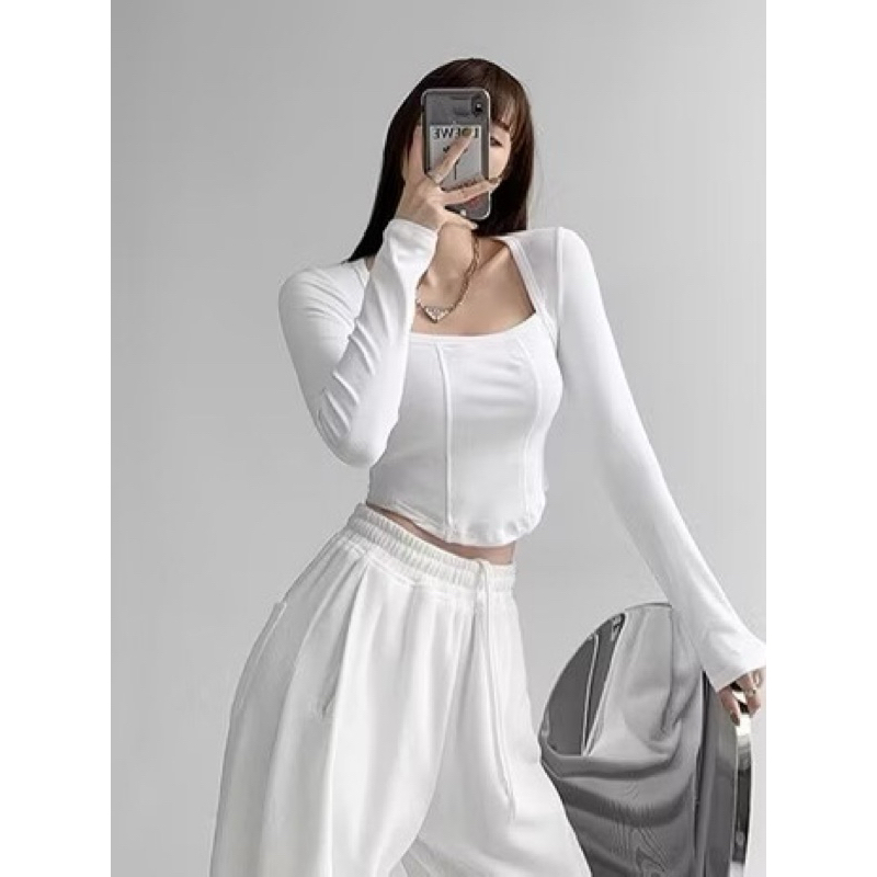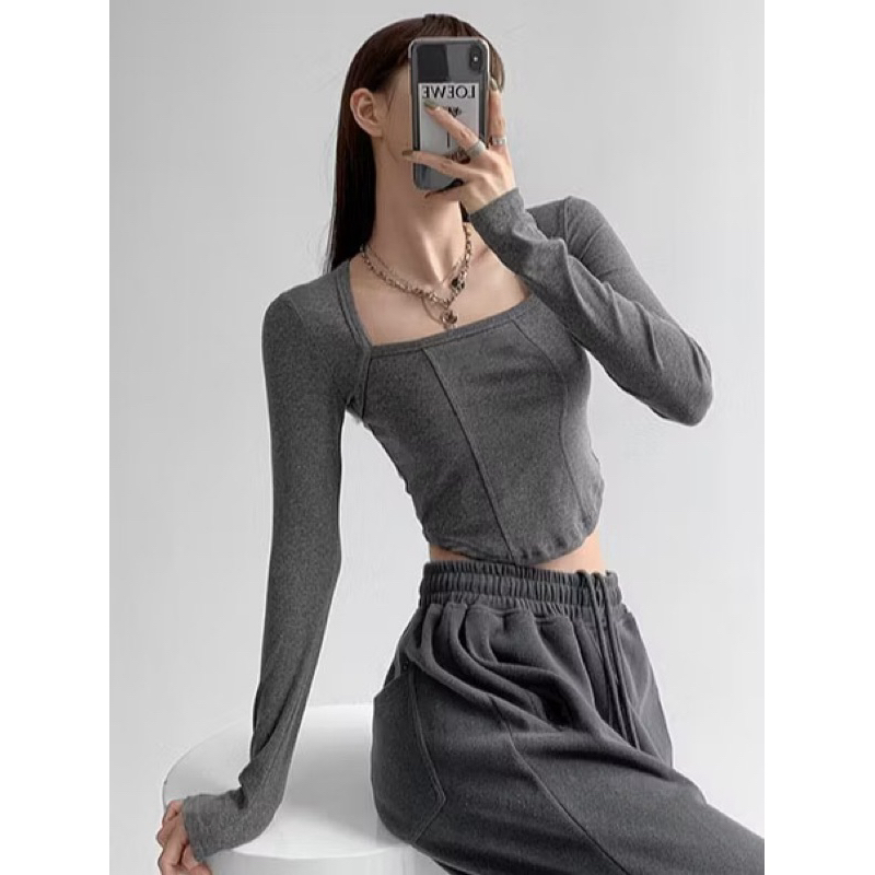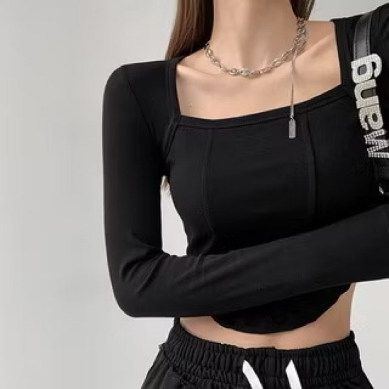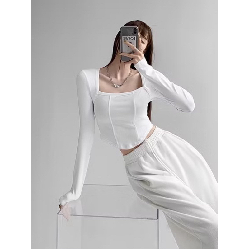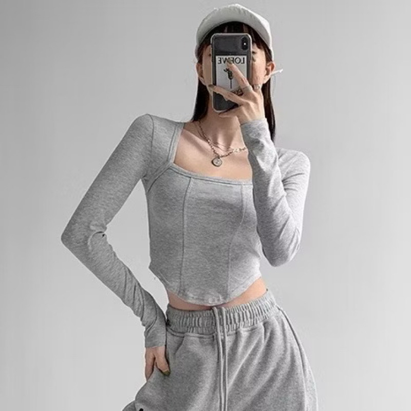 Maggie Kaos Crop Lengan Panjang Leher Kotak Crop Top Long Sleeve Terbaru