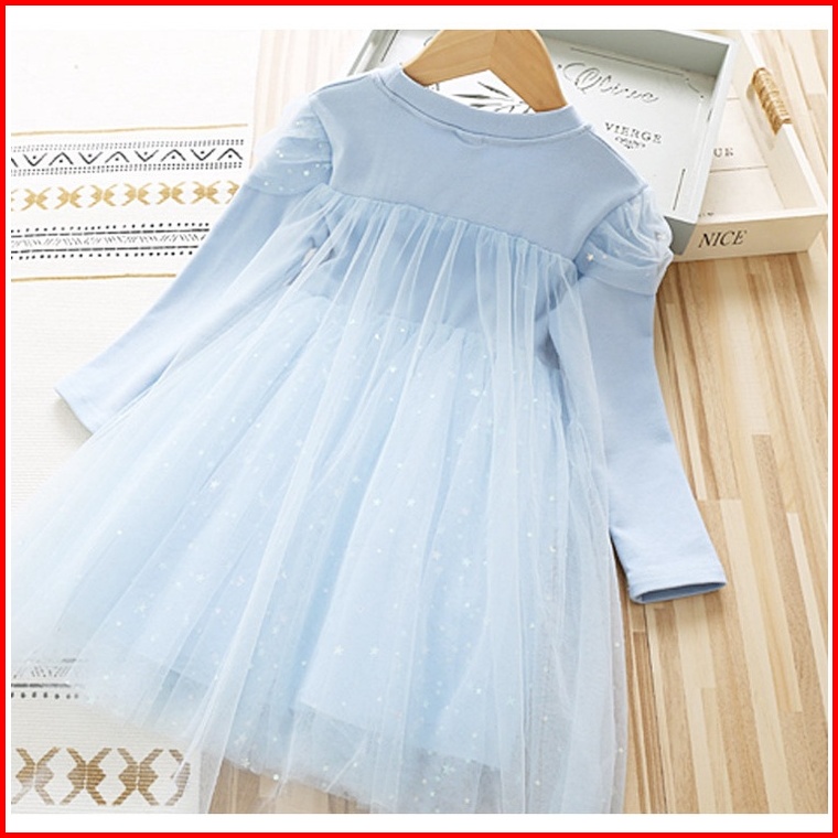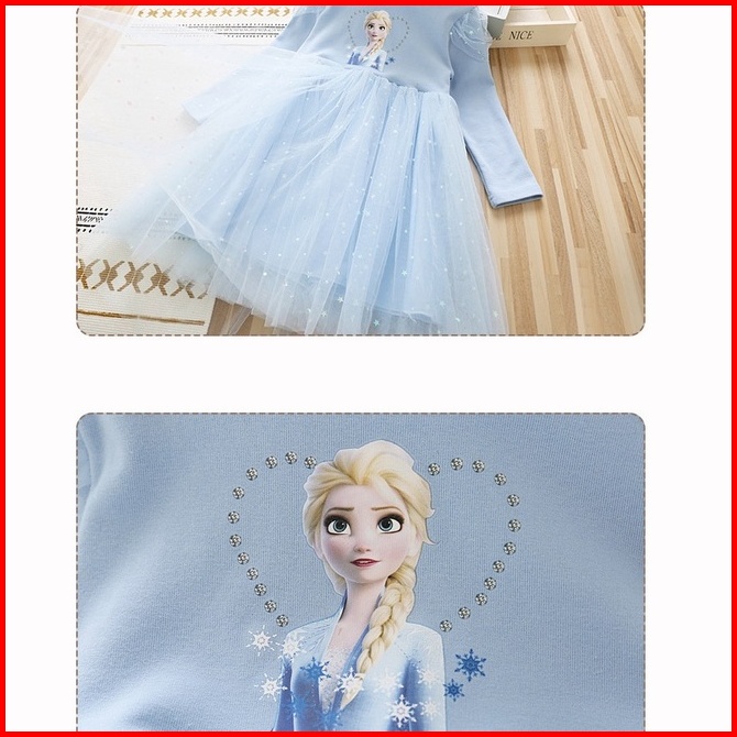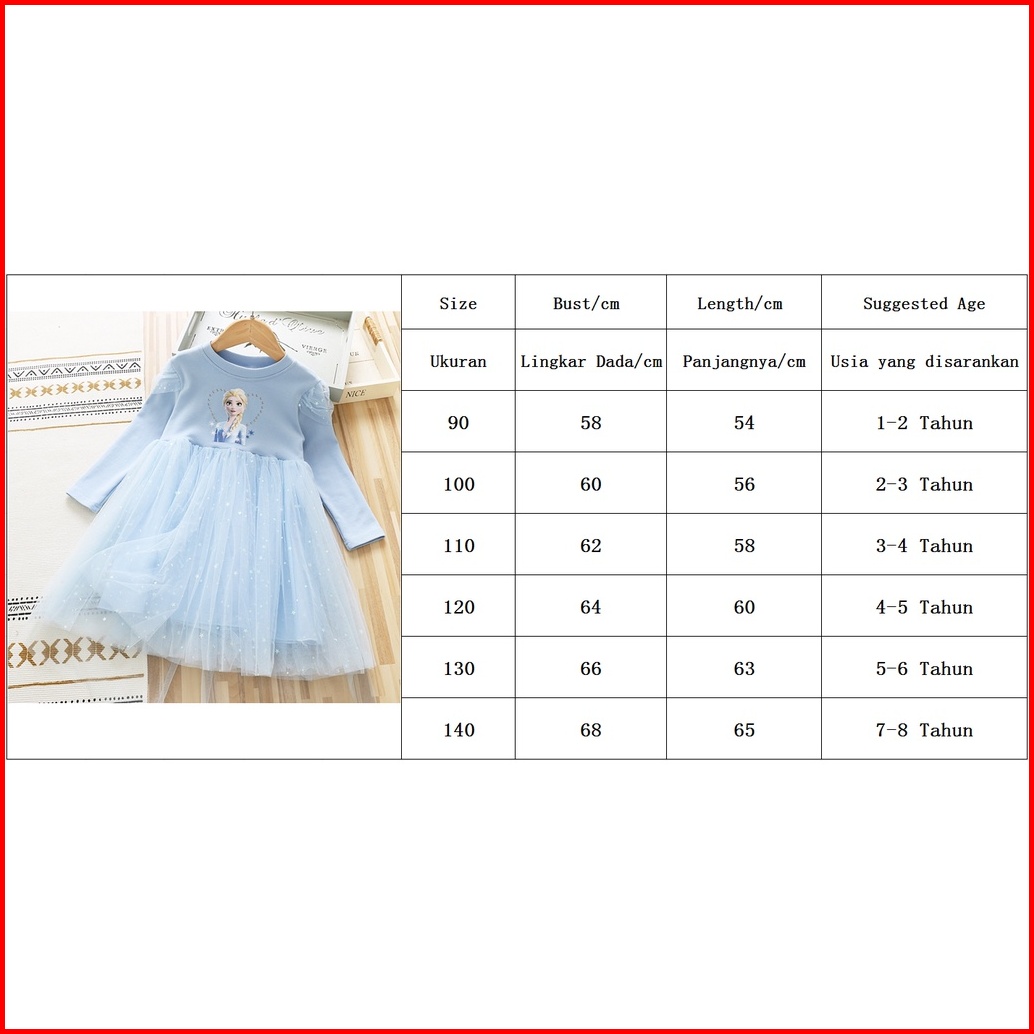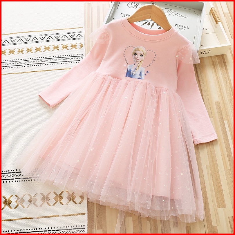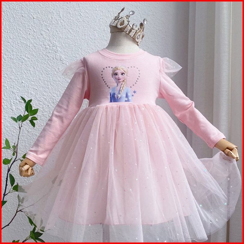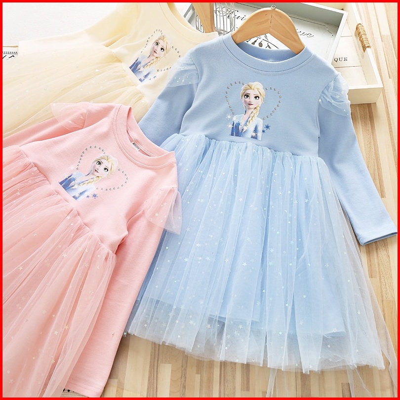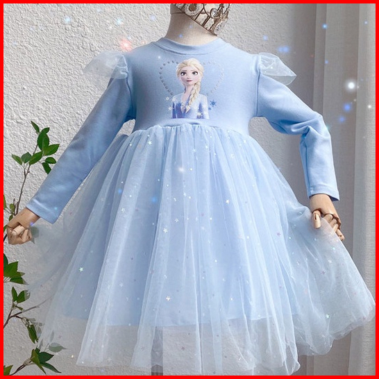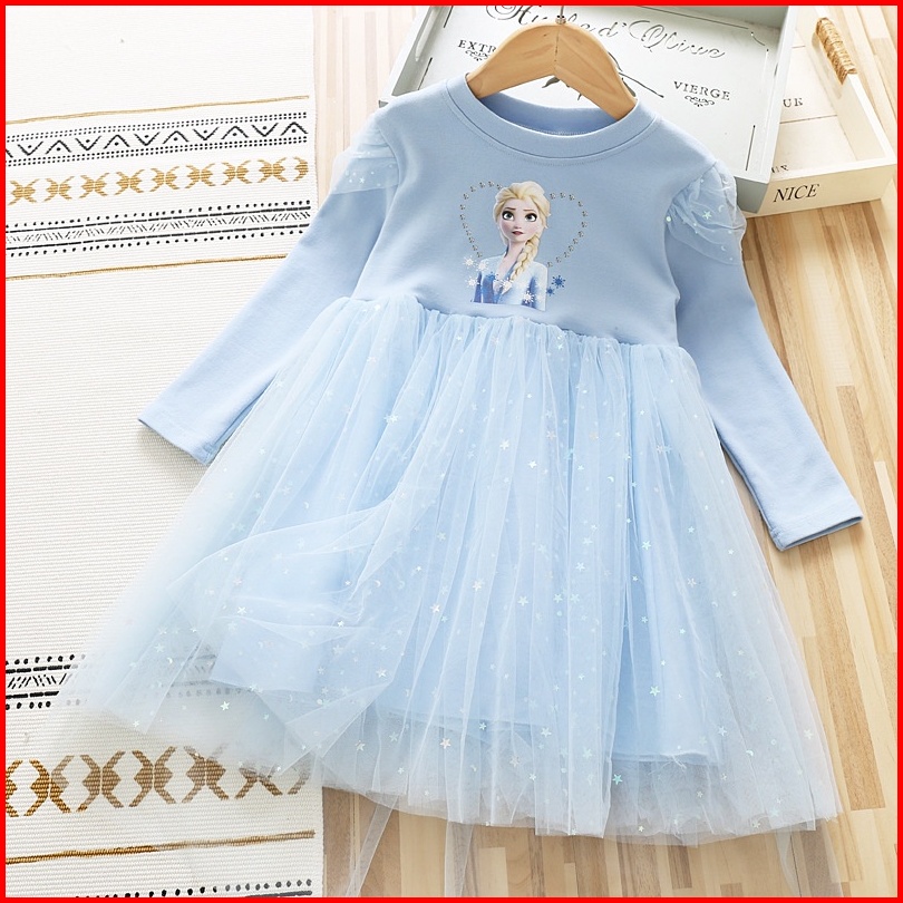 Anak Perempuan Frozen Elsa Dicetak Tulle Princess Dress Anak Lengan Panjang Elsa Gaun Pesta