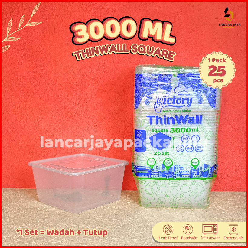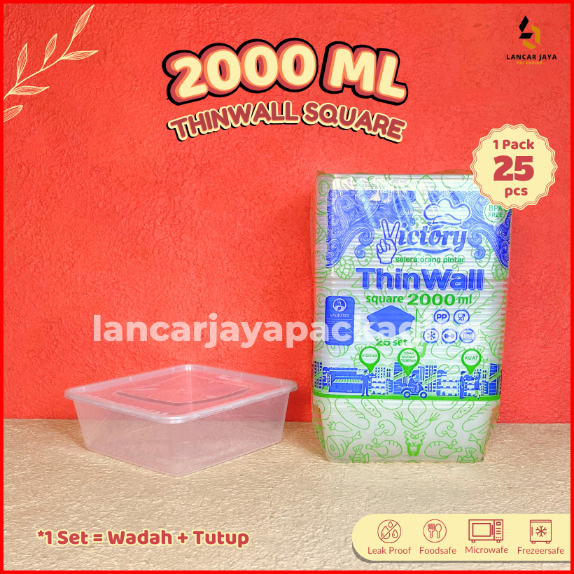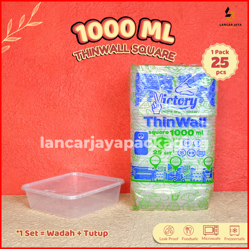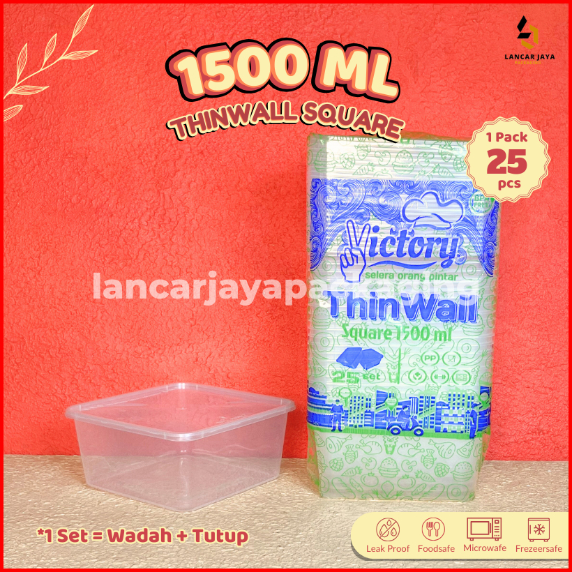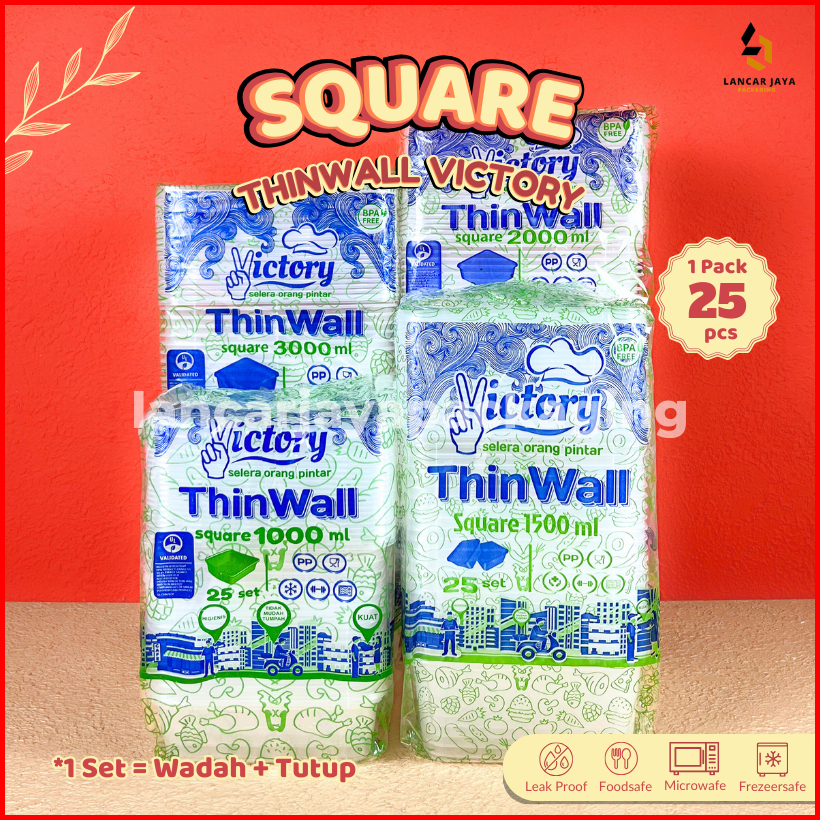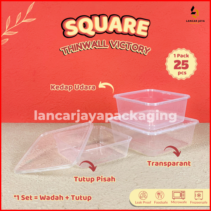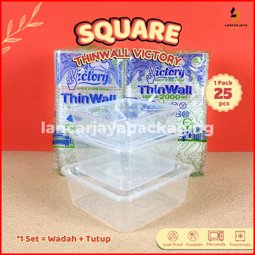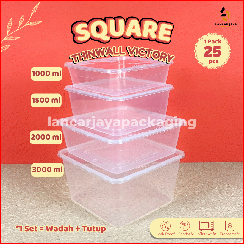 25 Pcs Thinwall Square Victory 1000ml 1500ml 2000ml 3000ml Kotak Makan Wadah Plastik Persegi