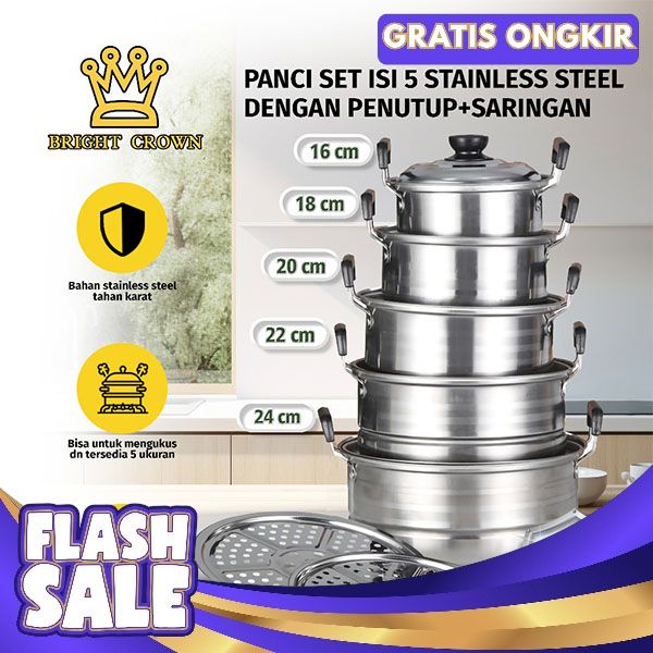 [Mall] BRIGHT CROWN 12IN1 PANCI STEAMER SET STAINLESS ISI 5 PCS + 2PCS KUKUSAN PANCI BAHAN TEBAL PREMIUM