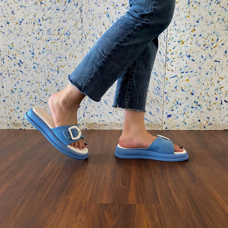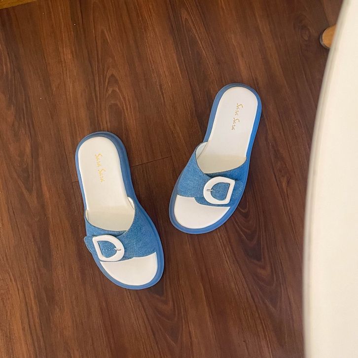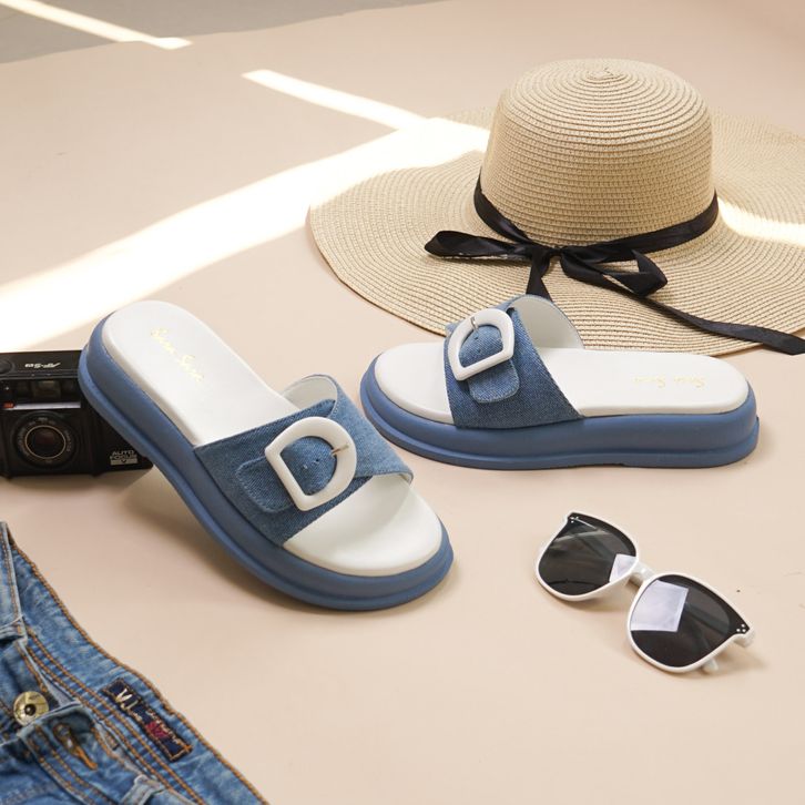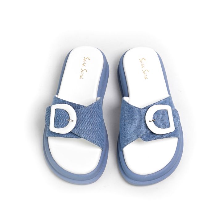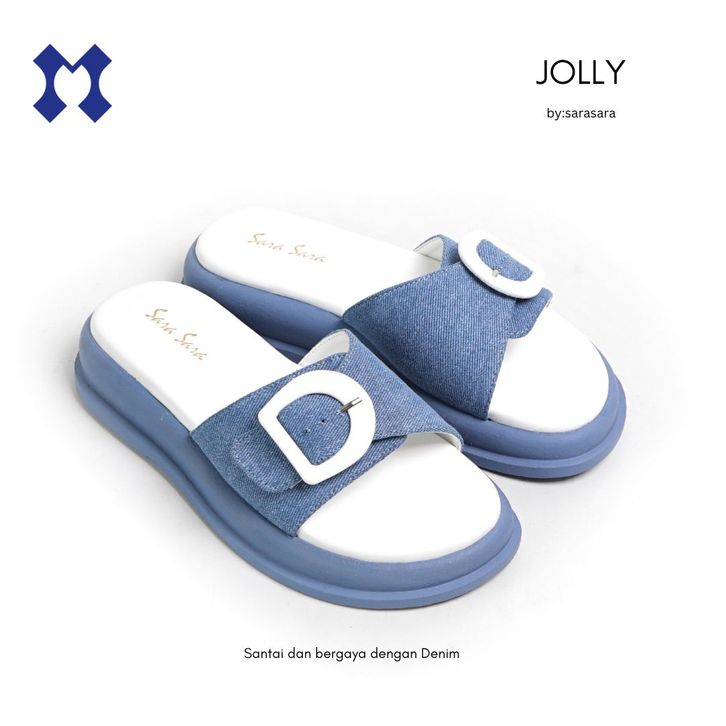 Sara Sara JOLLY Sandal Slop Wanita Kekinian Sendal Denim Cewek Bahan Jeans Gesper Terbaru