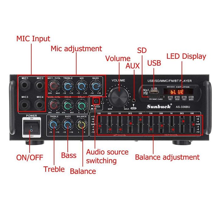 Audio Amplifier Home Theater Karaoke Bluetooth EQ FM Radio 2000W - Sunbuck AV-326BT & AS-336BU