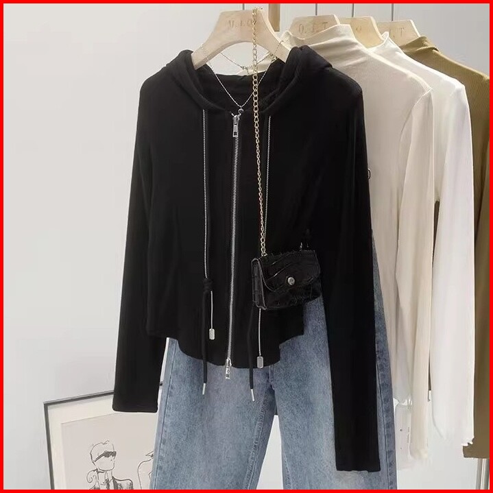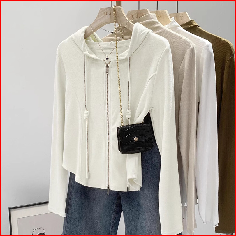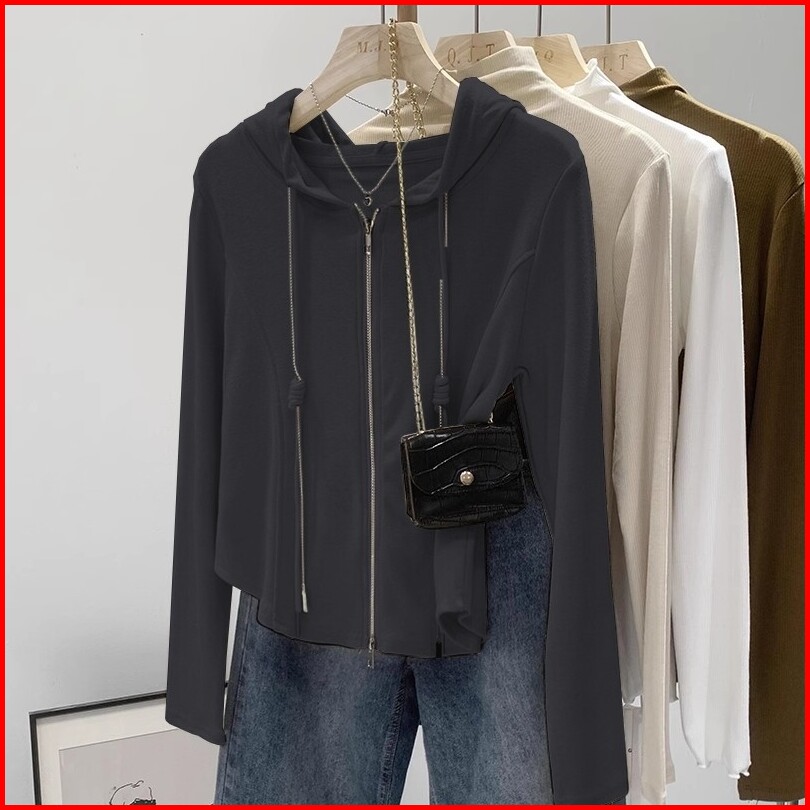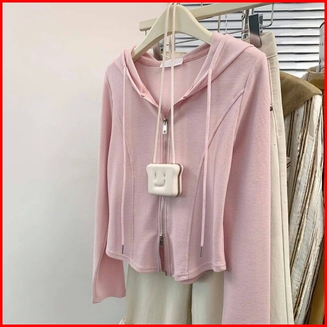 Hoodie Lengan Panjang Merah Muda Dengan Resleting Ganda