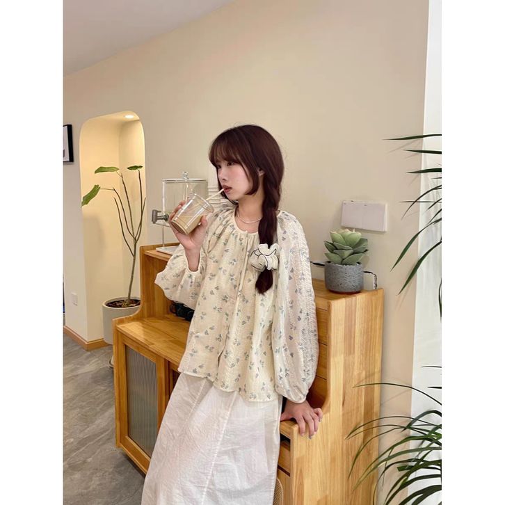 EKOUAER BLOUSE BUNGA PUTIH KOREAN STYLE LENGAN PANJANG HIJAB BAJU ATASAN WANITA TERBARU ATASAN WANITA KEKINIAN CROP TOP