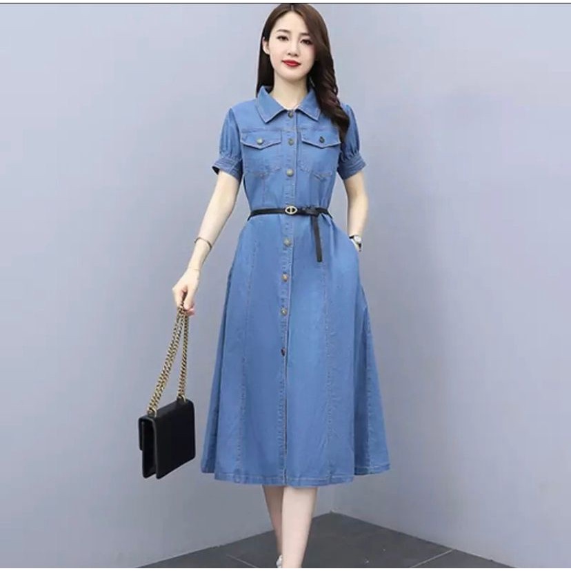 DRESS JEANS WANITA LENGAN PENDEK / LONG TUNIK JEANS WANITA LENGAN PENDEK ( FREE BELT )
