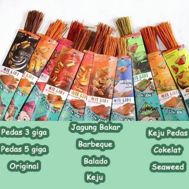 Pedas 3 Giga , Lidi BALADO , Lidi BBQ, Lidi JAGUNG BAKAR , Lidi RUMPUT LAUT1 , Lidi KEJU, Lidi KEJU PEDES , Lidi CHOCOLATE , LIDI ORI, SOSIS Bakar