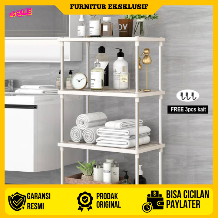 Rak dapur plastik acsthetic rak susun rak serbaguna rak panci putih 4 layer dengan roda free 3 kait