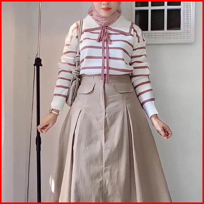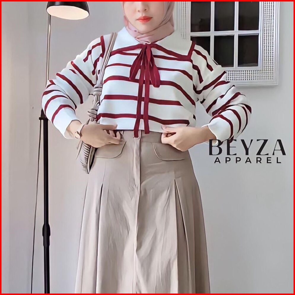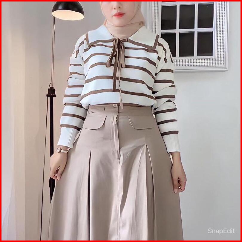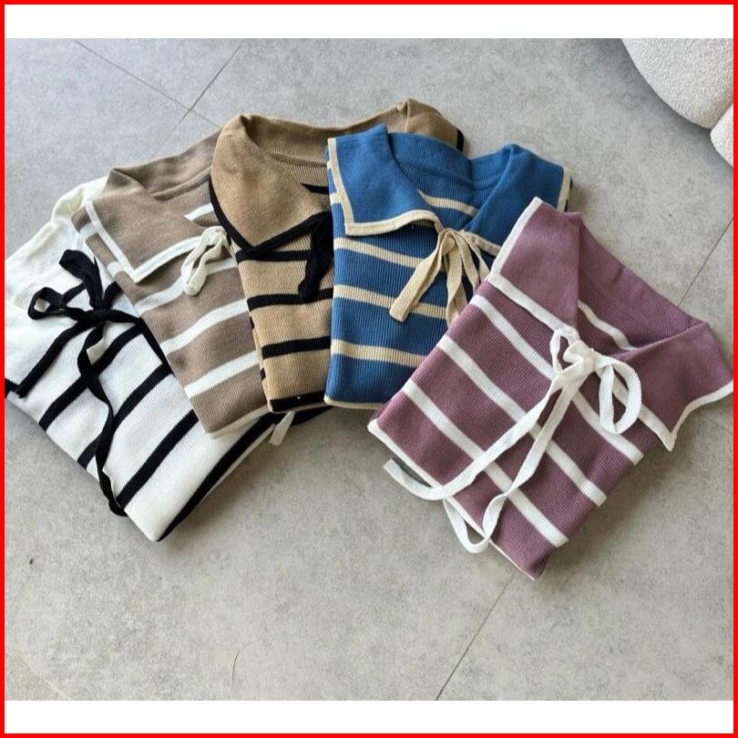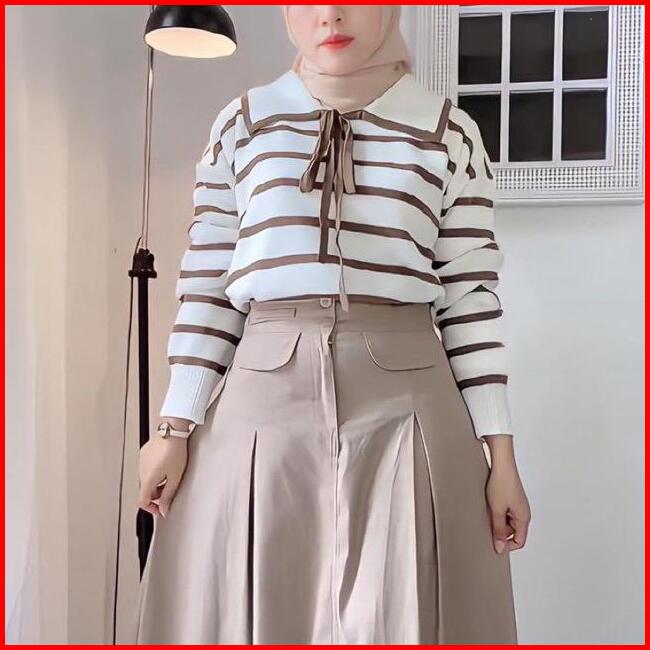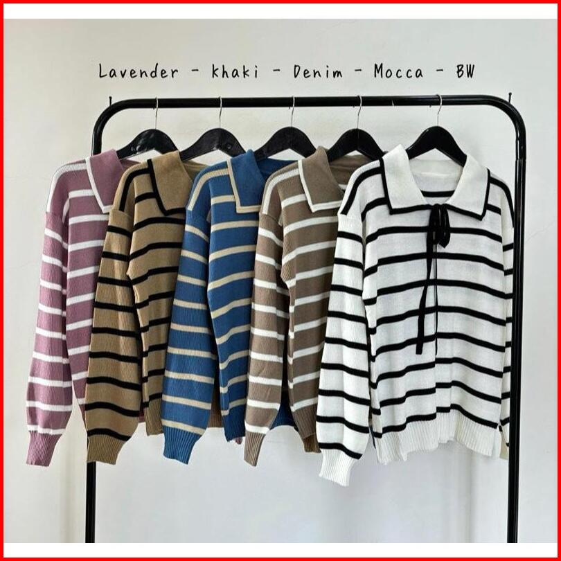 Louren Blouse - Atasan Blouse Wanita Berkerah Pita Motif Garis Korean Style