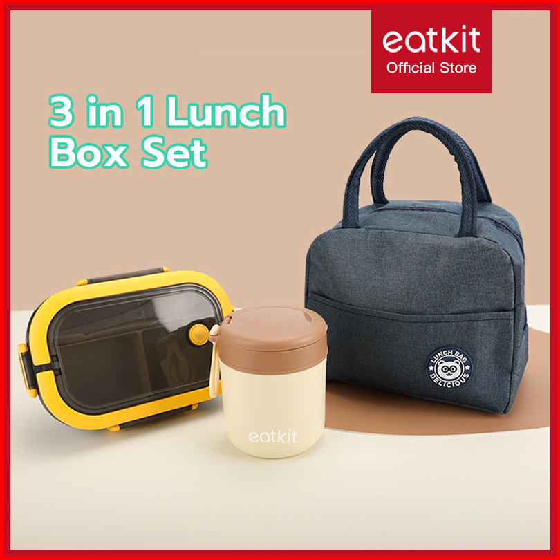 Eatkit 1200ml Lunch Box Set 3 Grid Kotak Makan Dan Mangkuk Sup 430ml Tempat Bekal Makan Anti Tumpah Tas Bekal