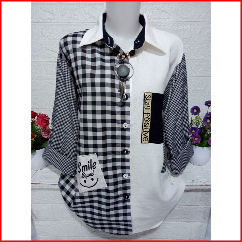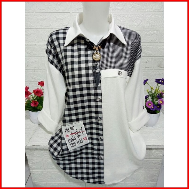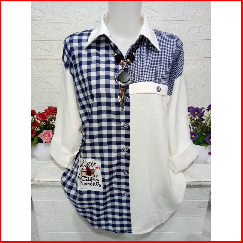 Baju Fashion Atasan Wanita Kemeja Model Kombinasi Tangan Panjang A336