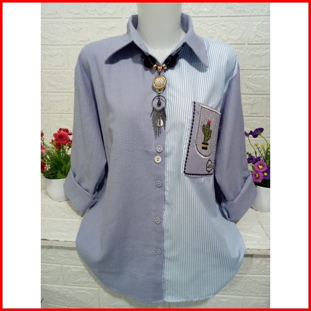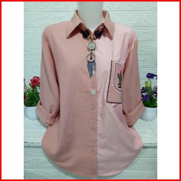 Baju Atasan Cewek Pakaian Wanita Kemeja Kombinasi Kekinian Lengan Panjang Katun Linen Import Premiumi B126p