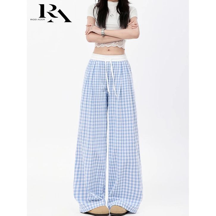 Celana panjang lebar kotak-kotak biru untuk wanita musim panas tipis 2025 baru kecil pinggang RIOD AOE