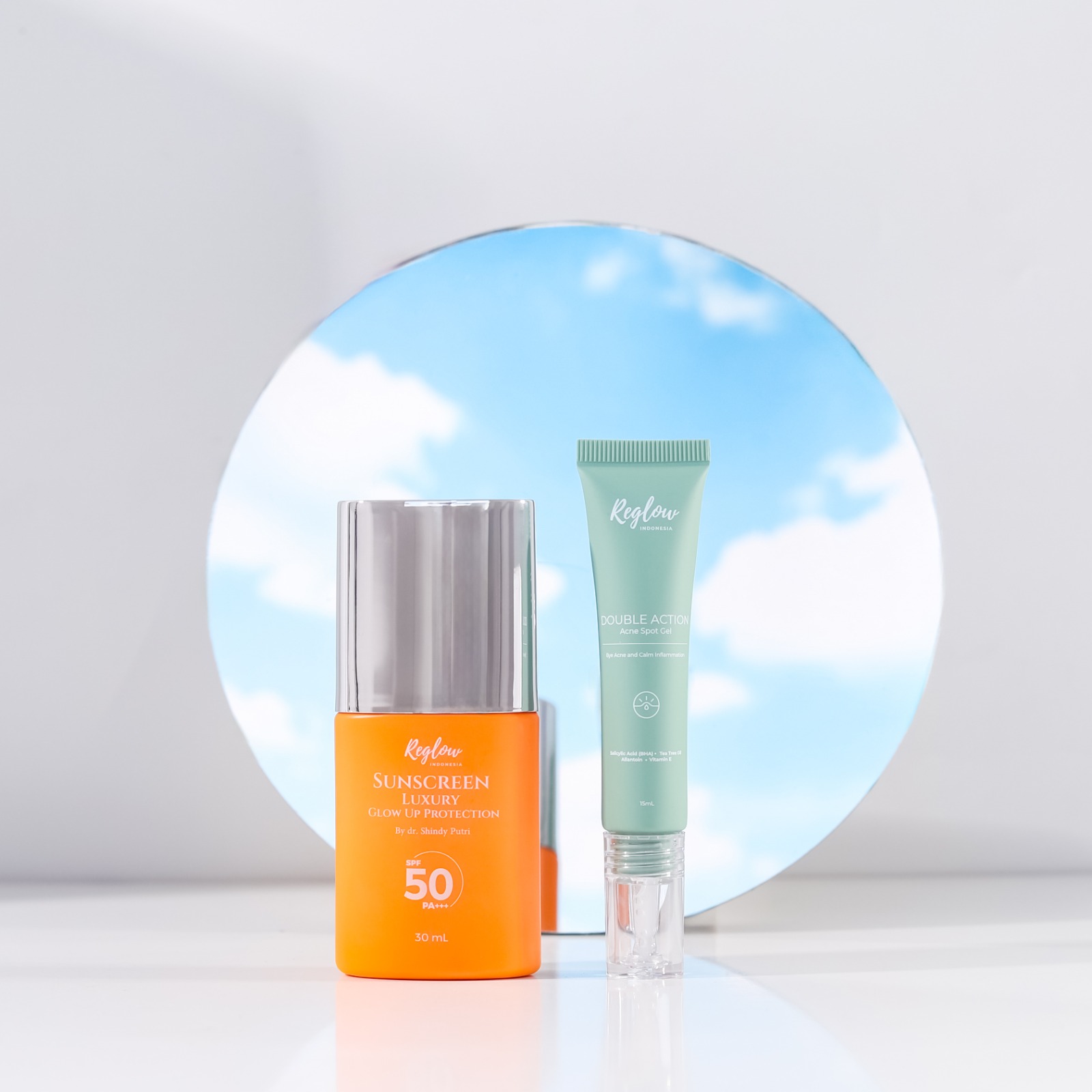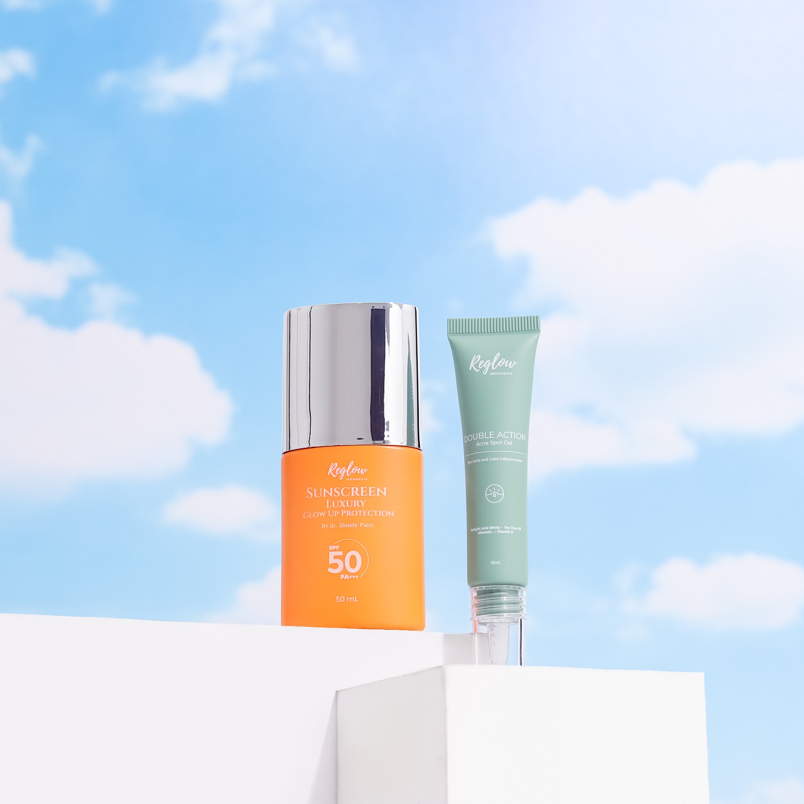 Paket Bundling Reglow Sunscreen Luxury 50 PA+++ + Acne Spot Gel Obat Jerawat BPOM
