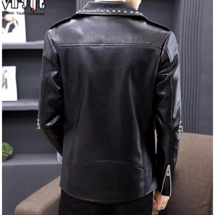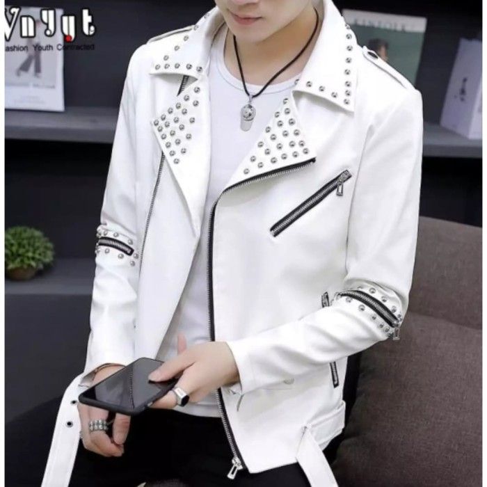 jaket pria ramones centang semi kulit/ jaket pria rock n roll kulit si - L Putih