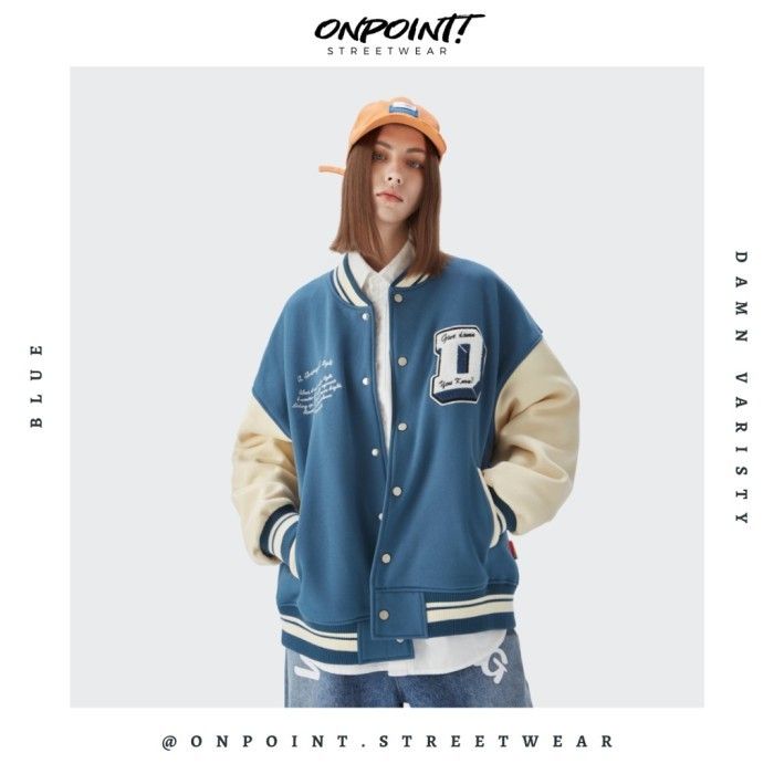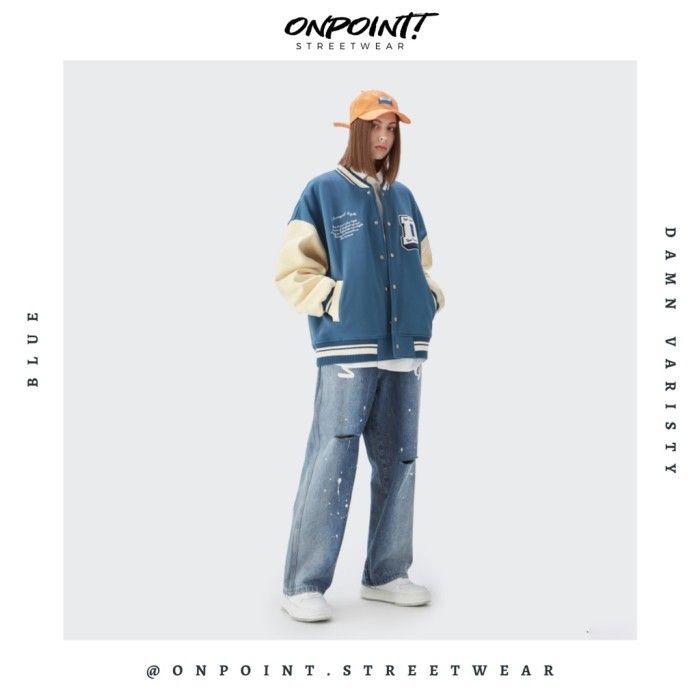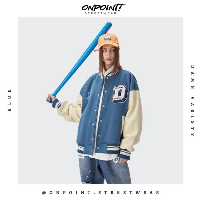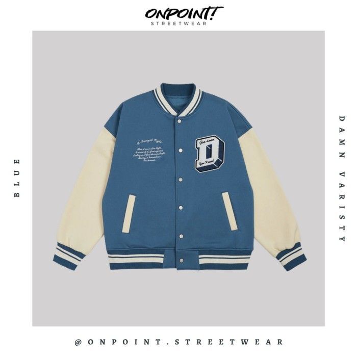 Damn varsity - jaket varsity pria gaya korea streetwear - biru S