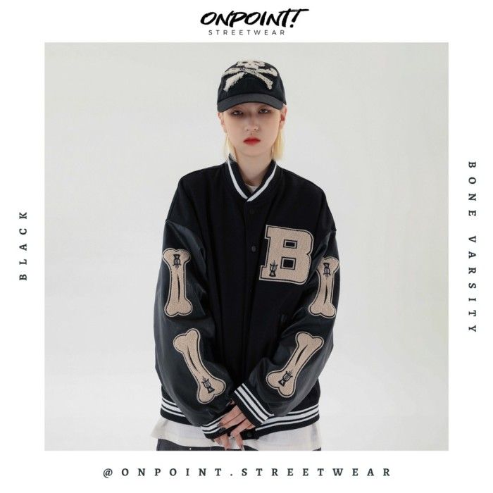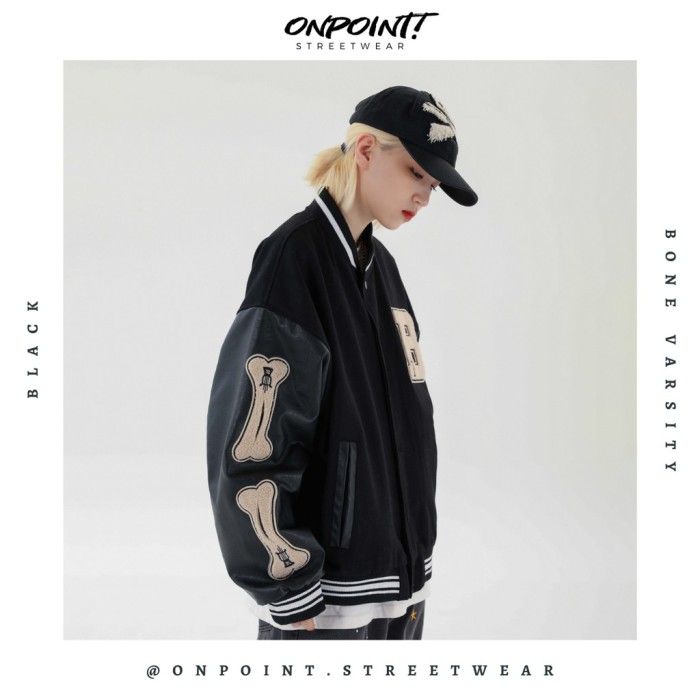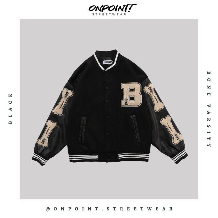 Bone Varsity - Jaket pria oversize pria streetwear - Hitam L