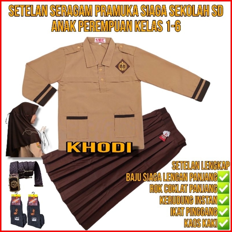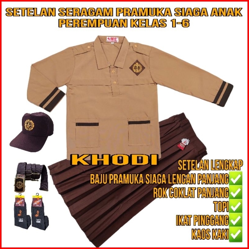 Setelan Seragam Pramuka Siaga List Sekolah Sd Anak Perempuan Baju Lengan Panjang Rok Panjang Coklat Paket Lengkap