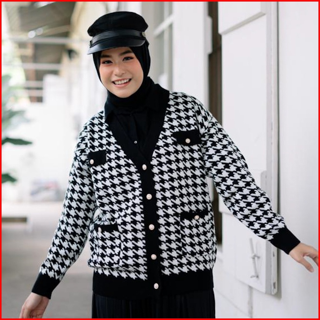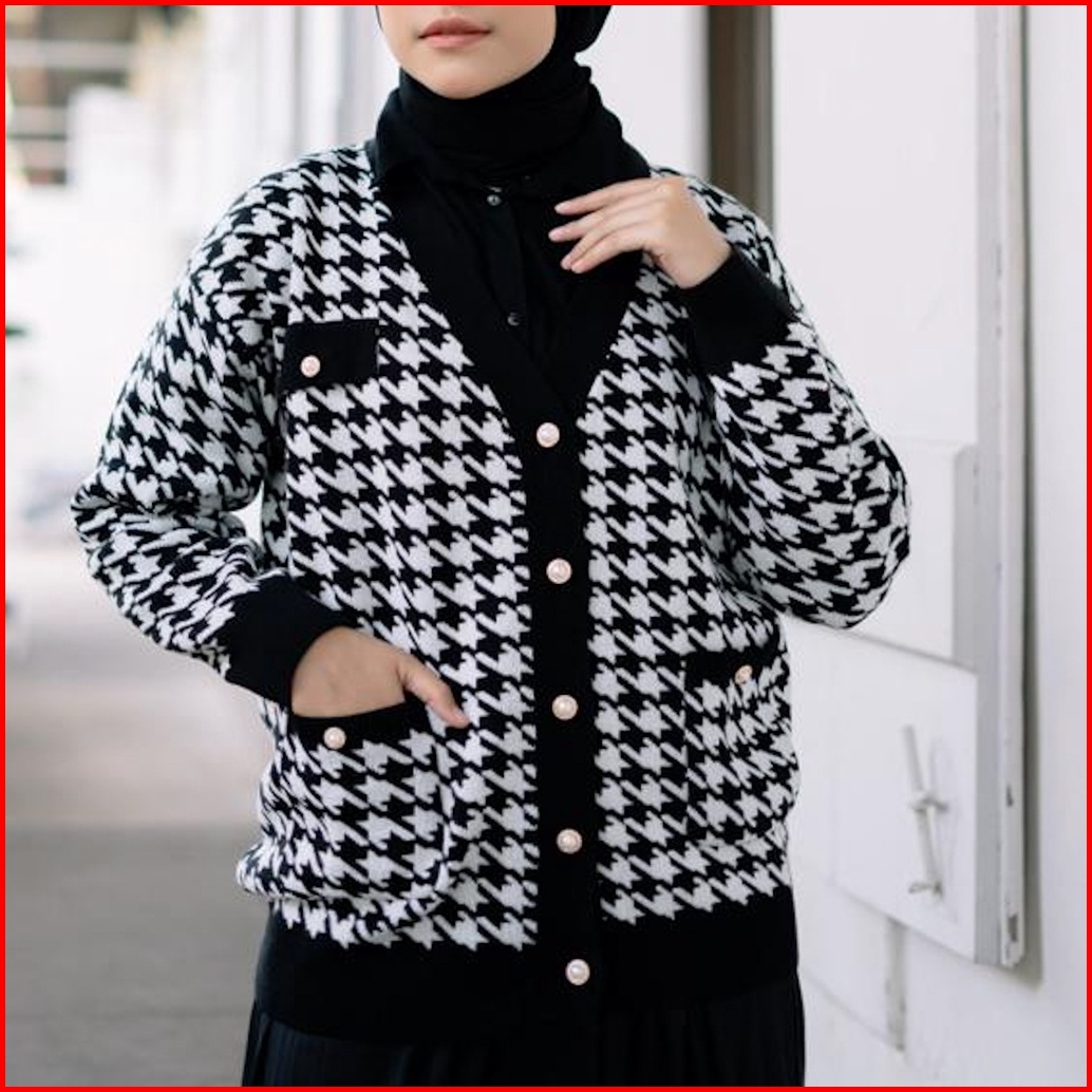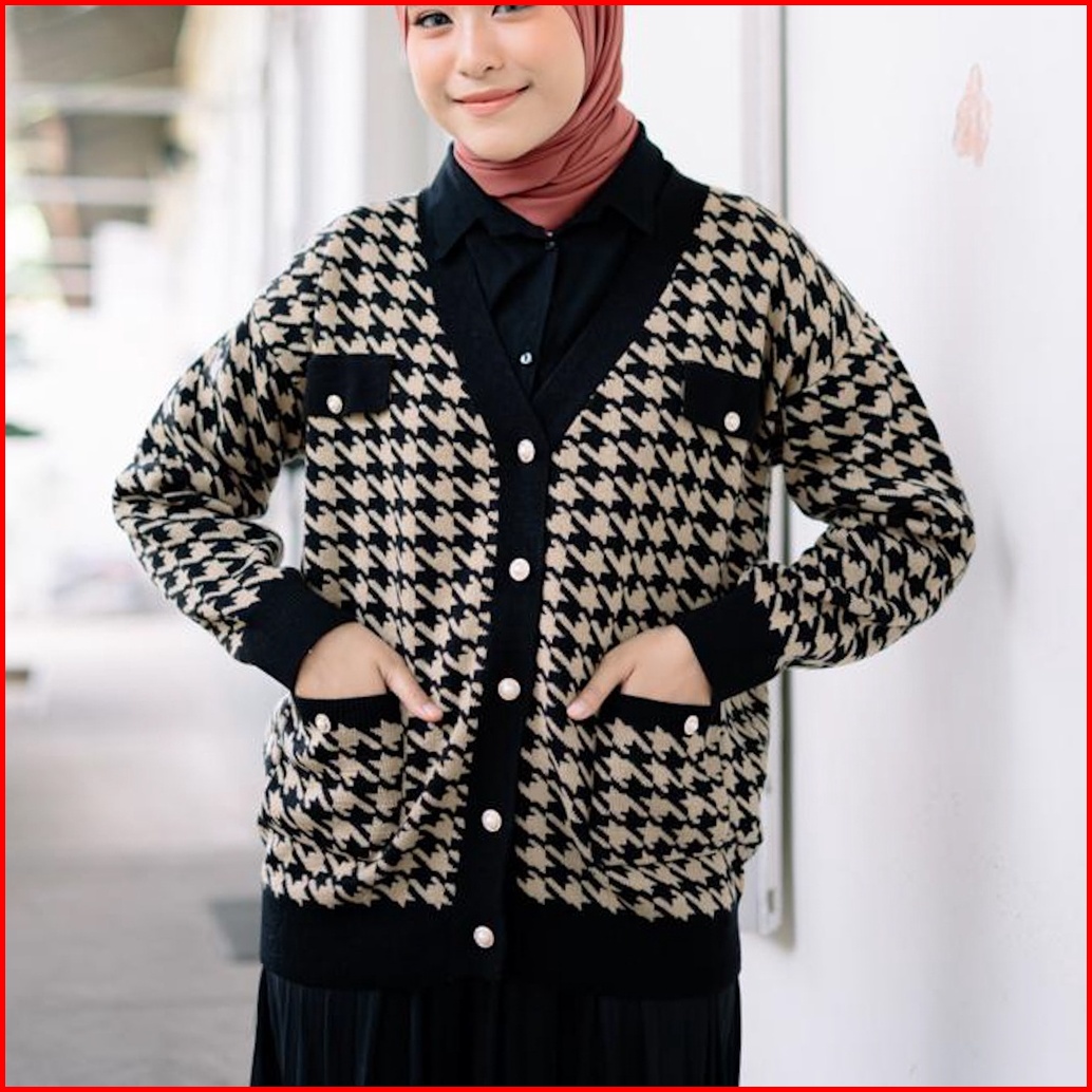 Fafour Alyssa Cardigan Rajut Wanita Saku Houndstooth Knitwear