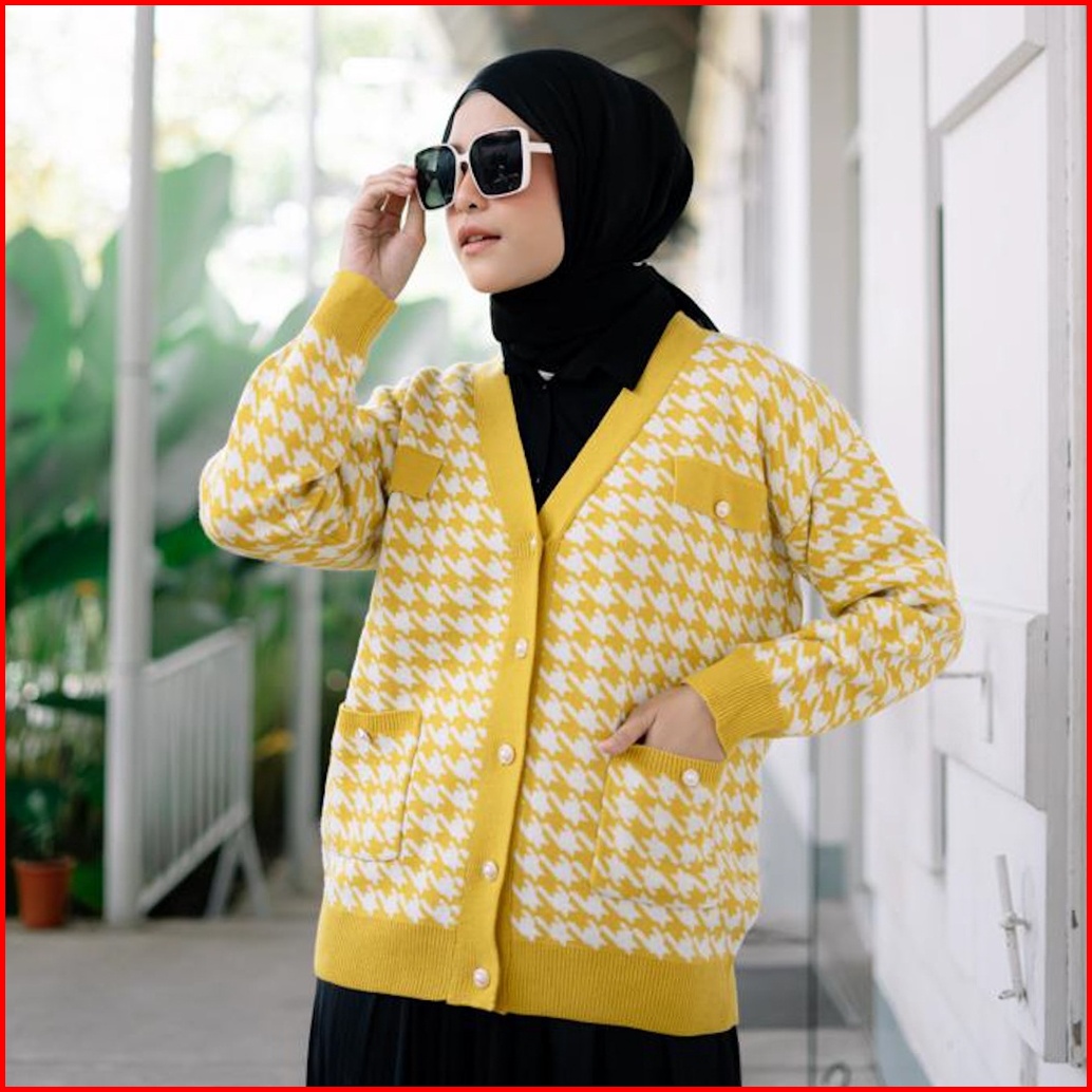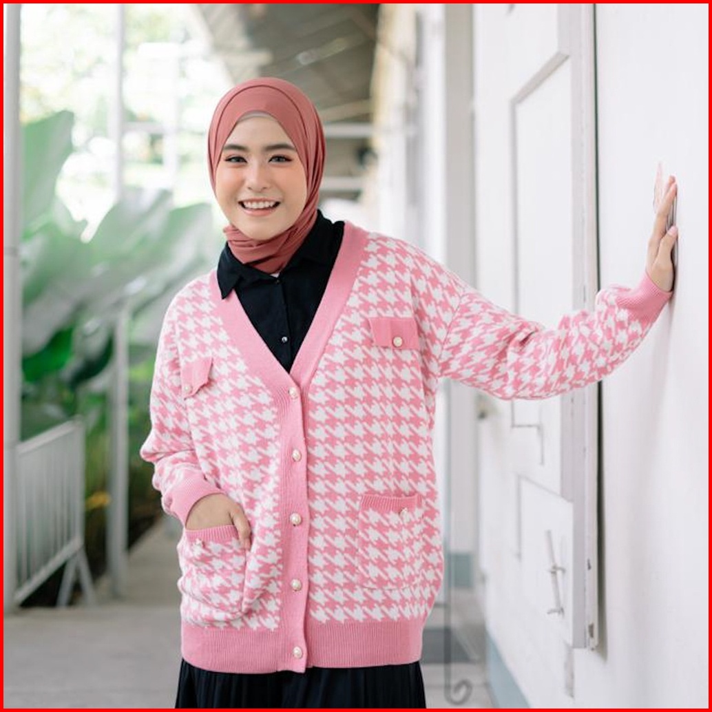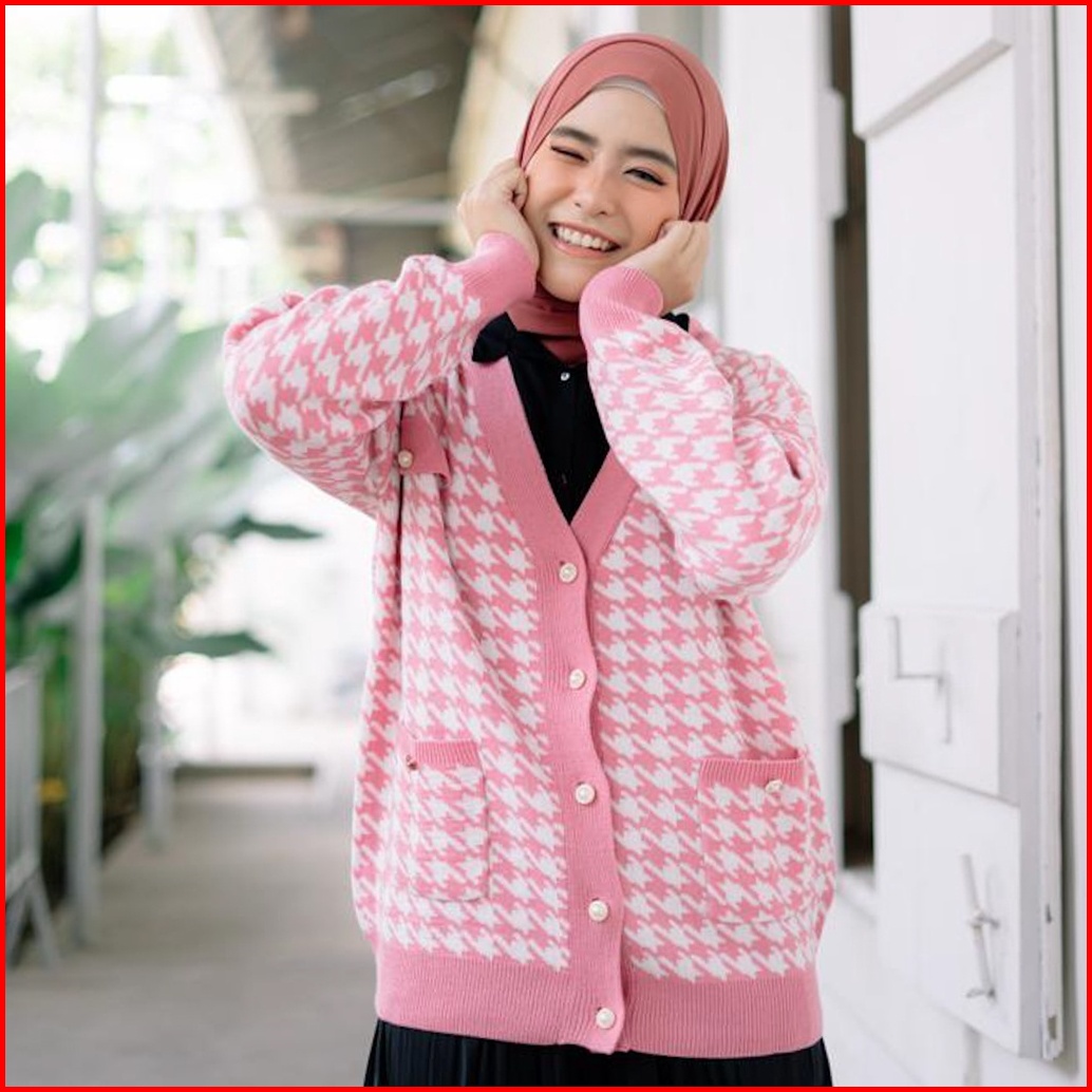 Fafour Alyssa Cardigan Rajut Wanita Saku Houndstooth Knitwear