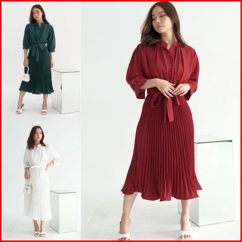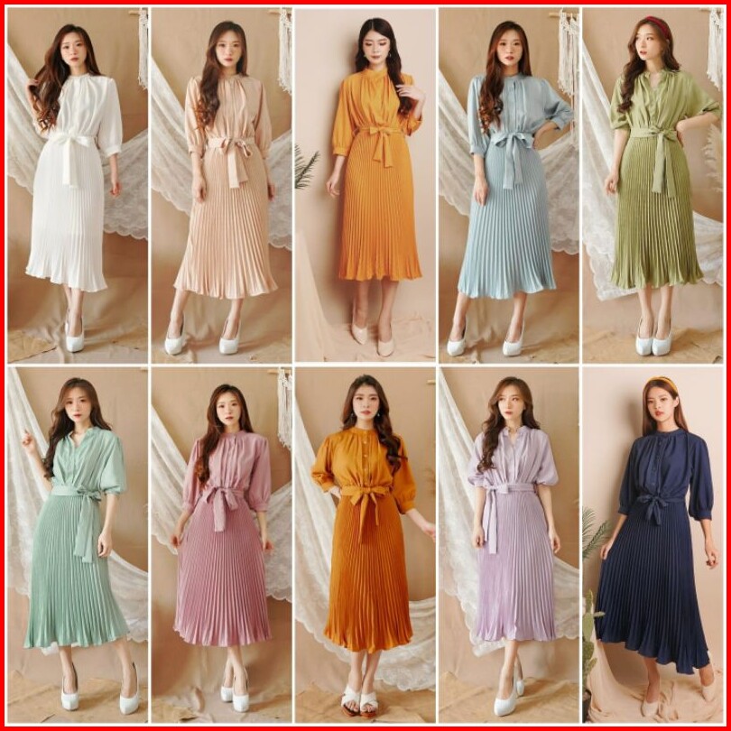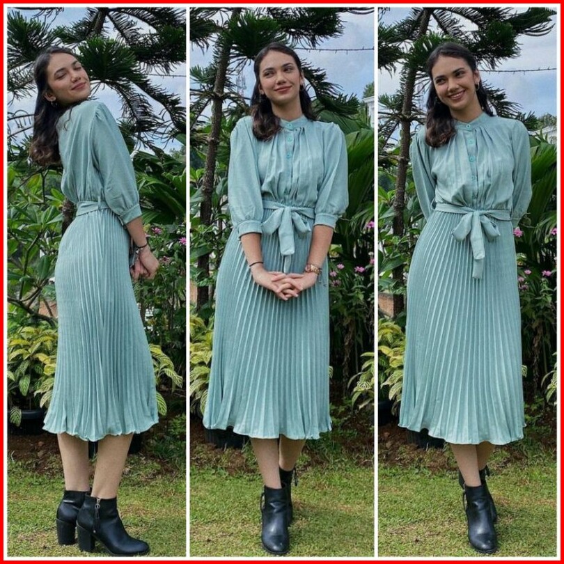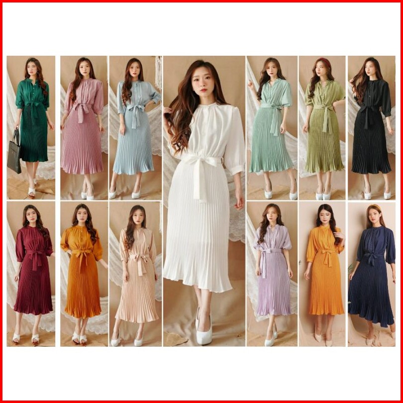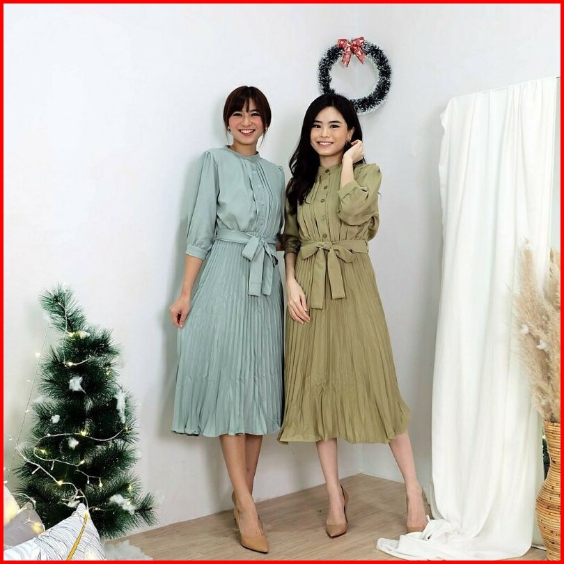 Termurah Best Seller Premium Gabrielle Mosscrepe Dress Pleated Button Plisket Pleated Obi Tied Midi Dress Busui Hijab Fr