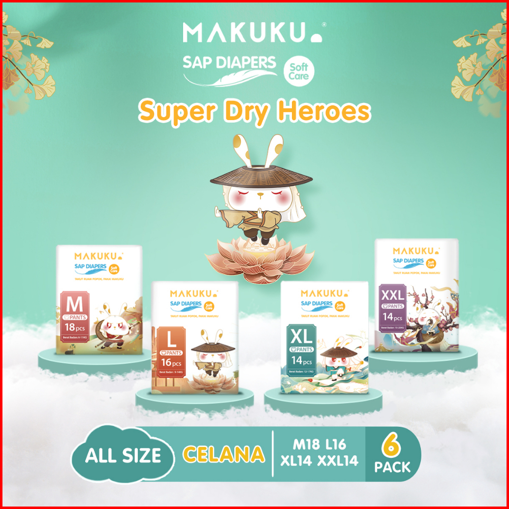 6 Pack Makuku Sap Diapers Soft Care Pants Ukuran Nb-s M L Xl Xxl Popok Bayi Anti Gumpal Super Dry