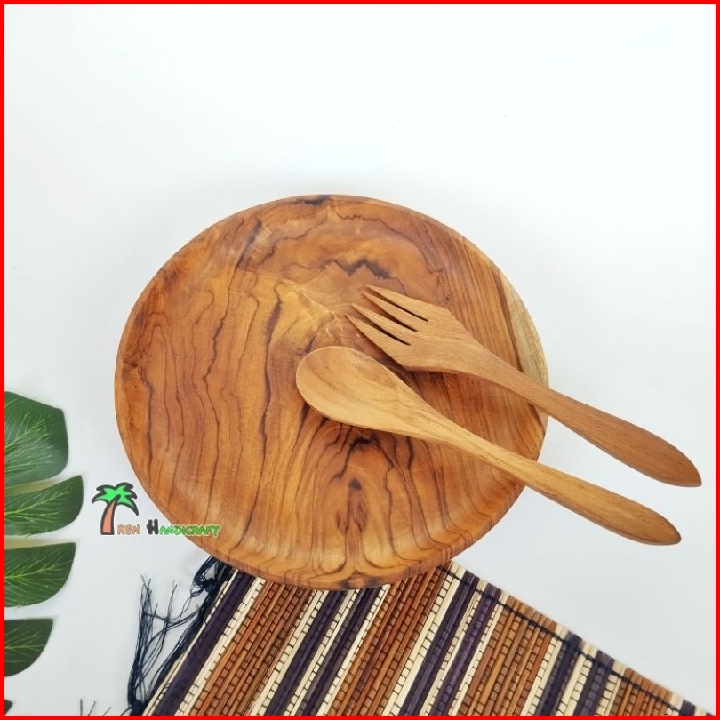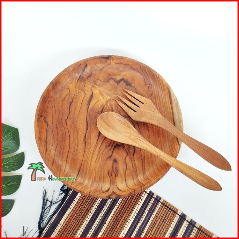 Arenhandicraft Piring Kayu Jati Liuk 20cm Dan Sendok Garpu