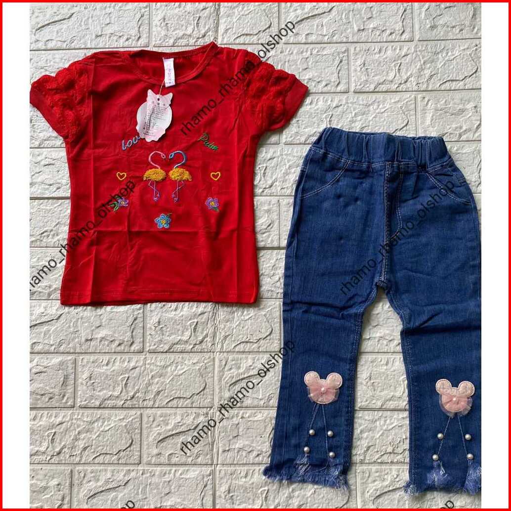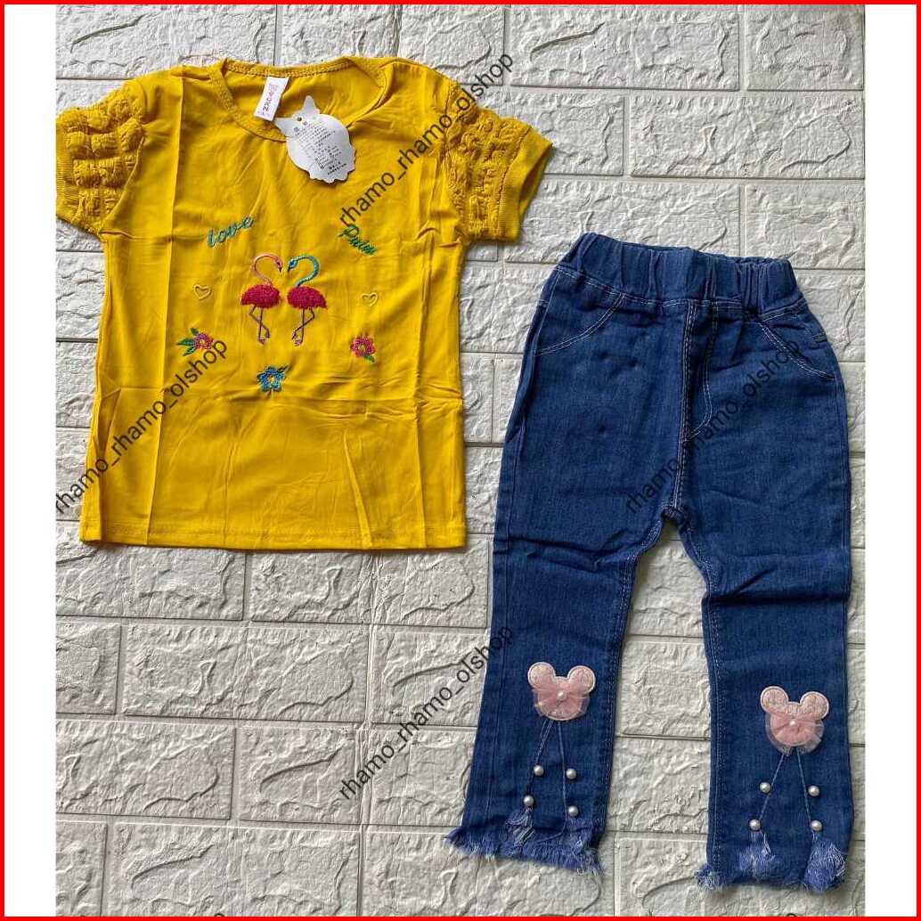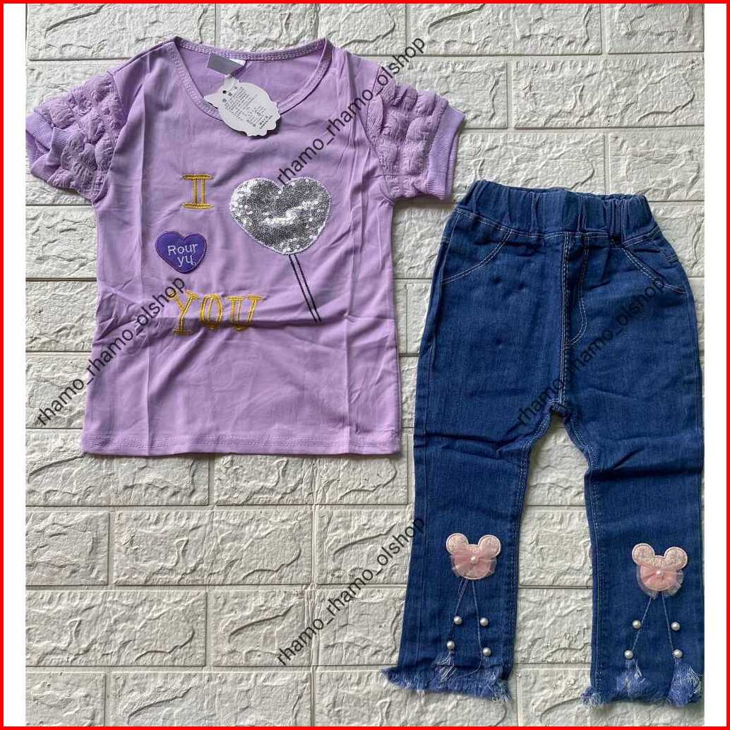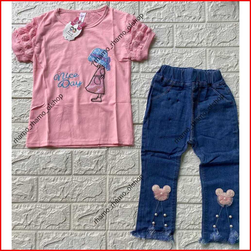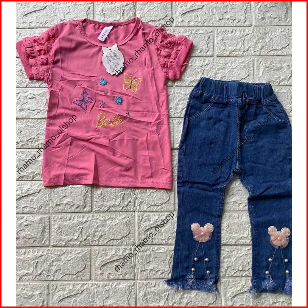 Stelan Kaos Pendek Model Lengan Jagung Celana Jeans Panjang Anak Perempuan