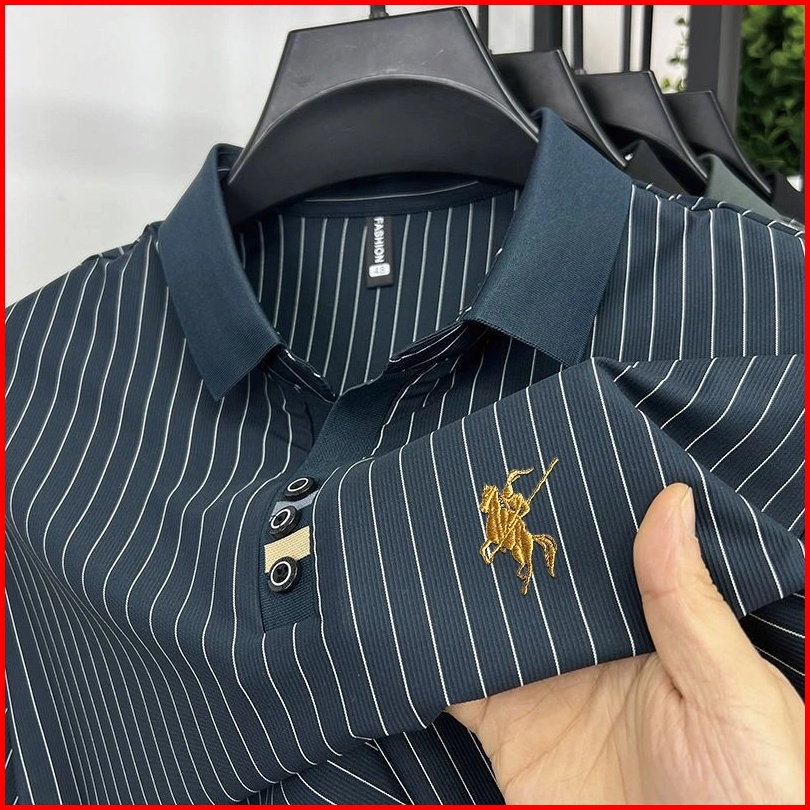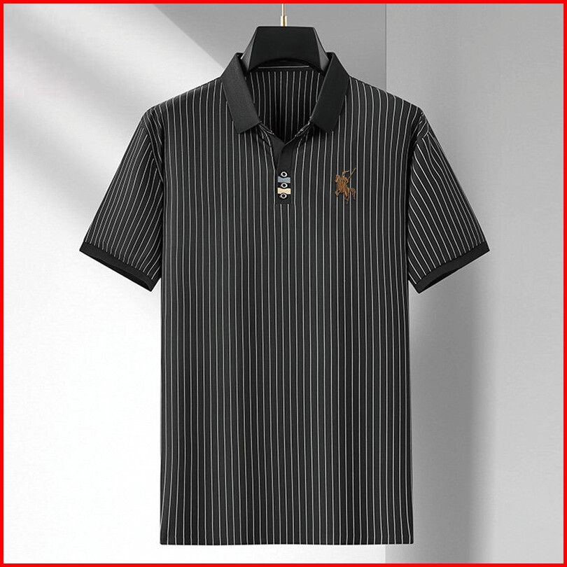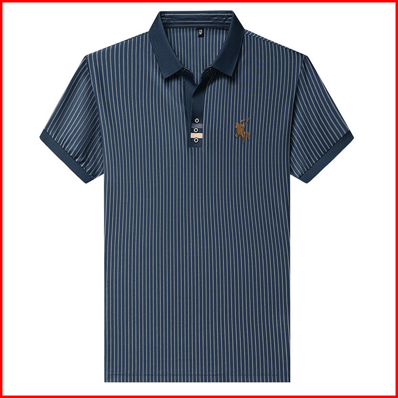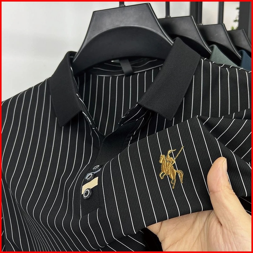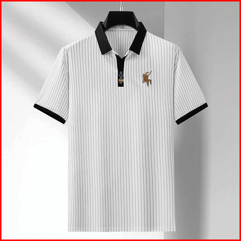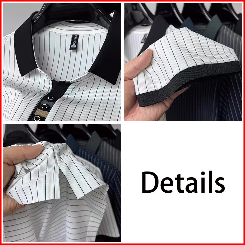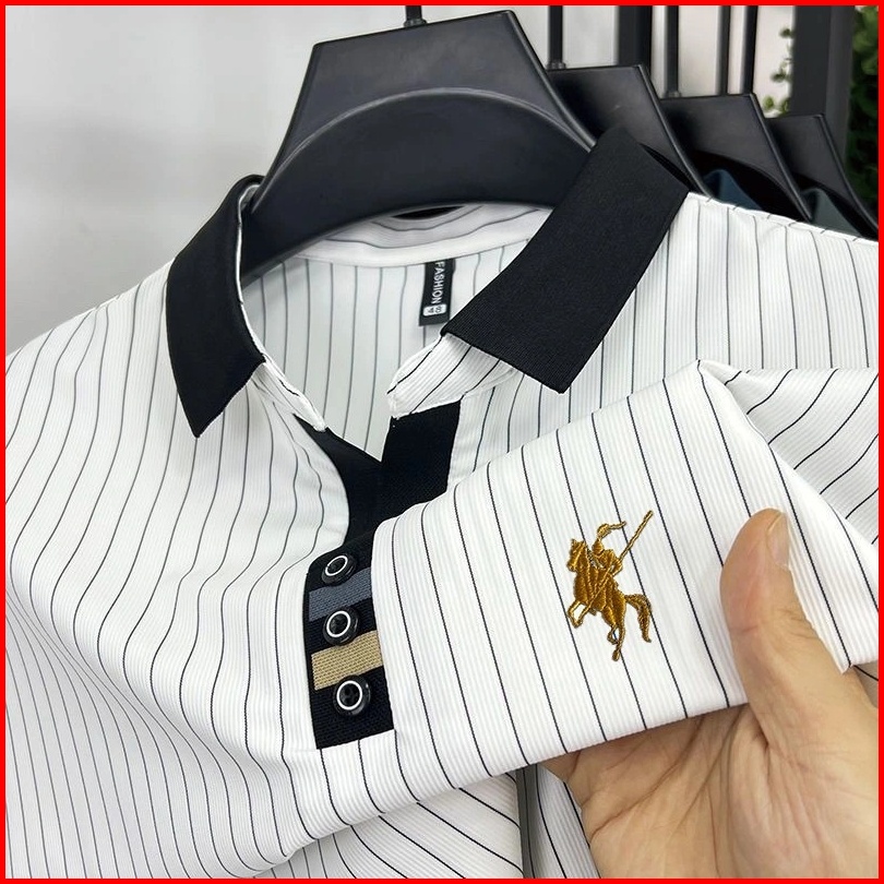 Polo Shirt Pria Putih Garis Vertikal Lengan Pendek Korean Style Kemeja Berkerah Dewasa Cowok Casual Kaos