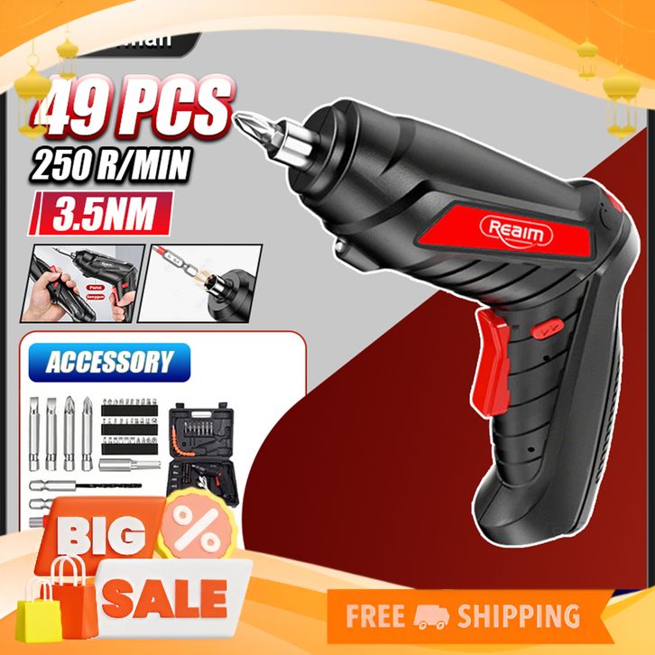[Mall] Reaim Cordless Screwdriver 4.2 V Mesin bor baterai impact cordless drill 49 pcs Set Screwdriver Baterai Bor mini