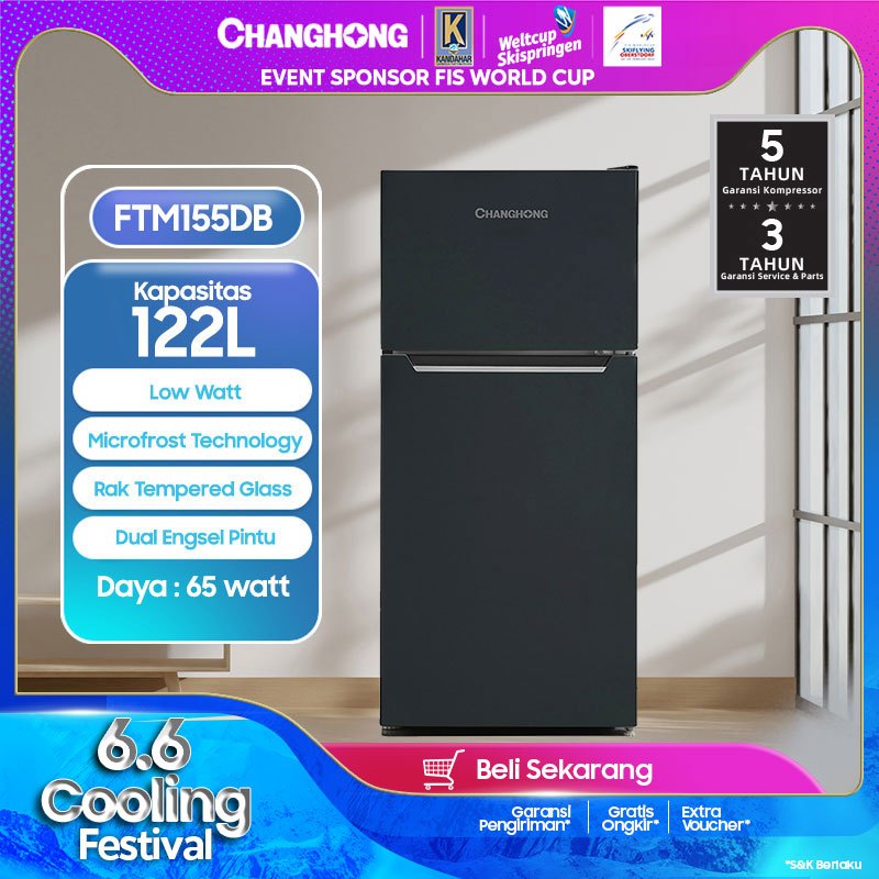 CHANGHONG KULKAS 2 PINTU REFRIGERATOR LEMARI ES KAPASITAS 122 LITER FTM155DB BLACK GARANSI 5 TAHUN