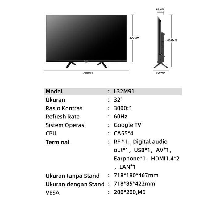 Changhong Google TV 32 inch Dolby Audio Bluetooth USB Google Assistant Smart TV Digital TV Free Vidio (L32M91)
