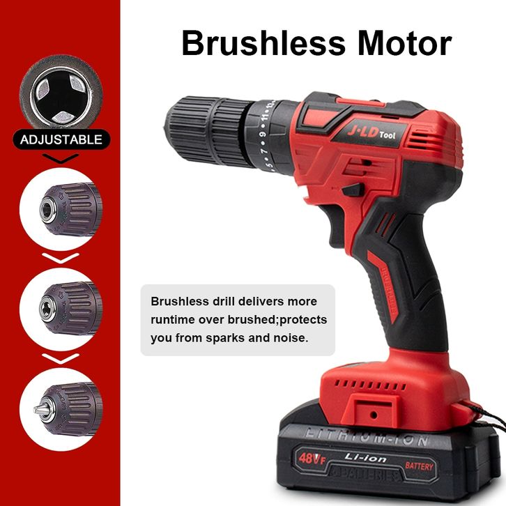 JLD Brushless 48V Mesin Bor Impact Drill 13mm keyless chuck 25+3 Bor tangan cordless 2 baterai fullset koper murah Bor t