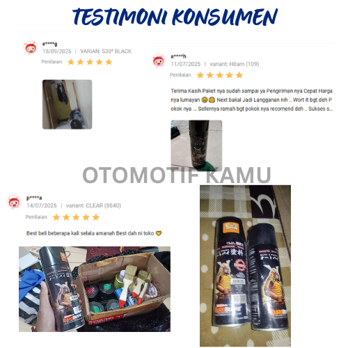 G*ld (123), Silver (124), S30* BLACK, WHITE (102) , EPOXY GREY UCH210, EPOXY SILVER UCY113 , STABILO RED (57), CLEAR GLOSSY (128) , CLEAR DOFF (128A), STORMY RED (Y123B), CANDY RED (Y112) , MATTE RED HONDA H751, MAT RED YAMAHA Y9595 , SIGNAL RED (23), H168* HONDA MAGENTA , TC Y242 PINK MAGENTA , Y719* PINK , H179* POWDER PINK, CD022* Candy Pink , X944* XIRALLIC RED, S138* BRIGHT RED , H138* RED R4L, 38 MAROON, Paint Polish GEIGI CM-05, Hitam (109) , Hitam Doff (109A) , Putih (102), Clear (128) , Clear Doff (128A) , Grey (104), Blue (312) , Tivoli Blue (9), Moviestar Blue / Biru Metalik Yamaha (Y688*), 164 Mikrolet Blue / Biru Angkot / Biru Muda, 371 LIGHT BLUE , Y3505** VIVID ORANGE, Royal Ivory (16) , 1103**CTM HONDA BLUE , 116 DEEP BLUE, 115 LIGHT SCARLET , 149 TAXI YELLOW
