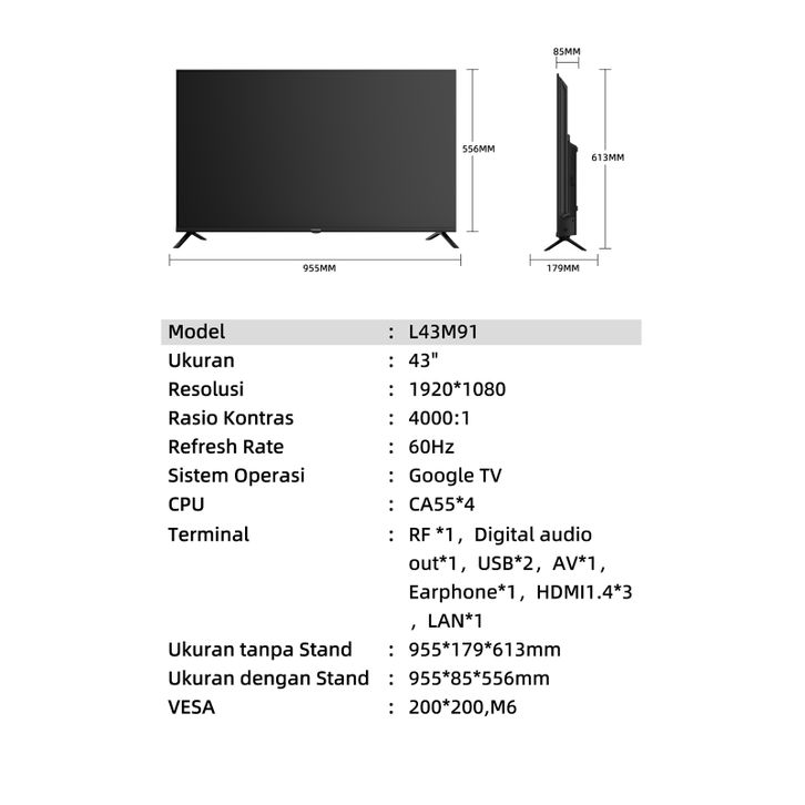 Changhong Google TV 43 inch FHD Dolby Audio Google Assistant Smart TV Digital TV Free Vidio (L43M91)