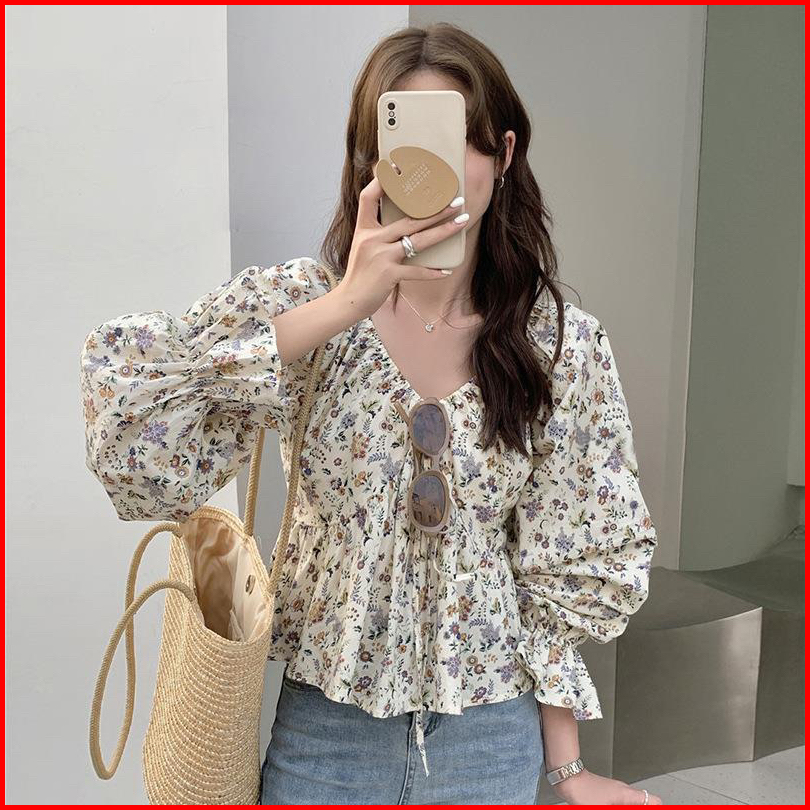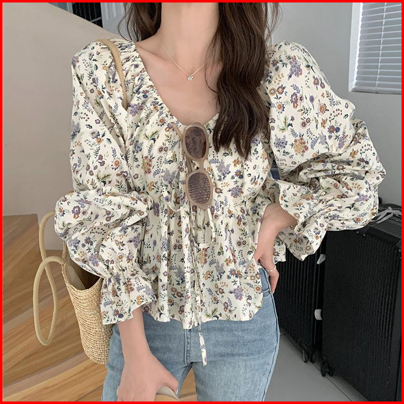 Zeline Blouse Bunga Atasan Wanita Serut Lengan Panjang Korea Style