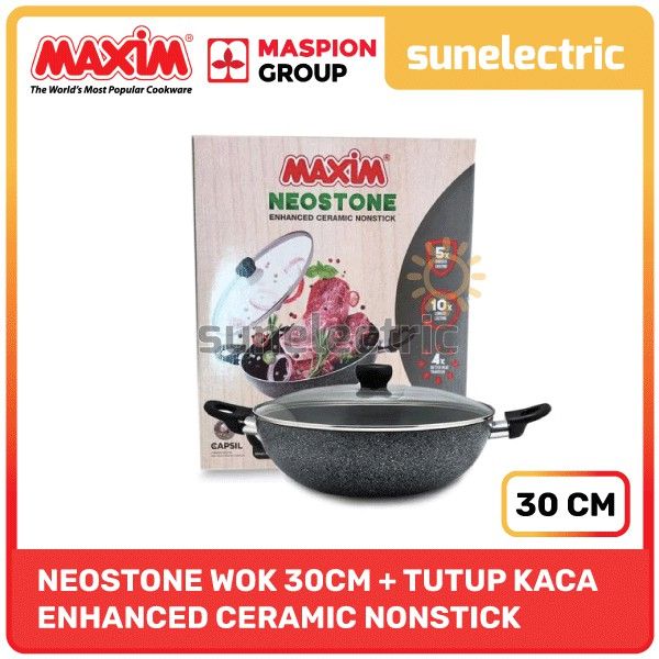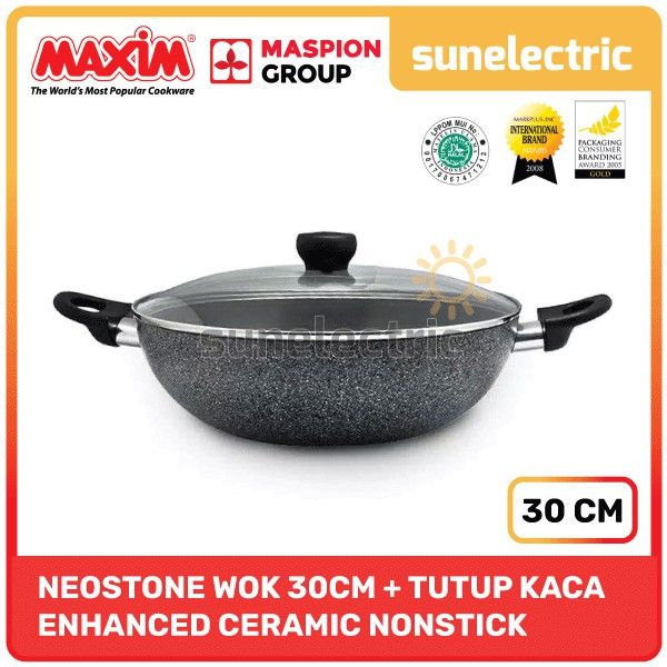Maxim Neostone Wok 30cm + Glass Cover / Wajan Keramik Teflon Anti Lengket 30 cm + Tutup Kaca