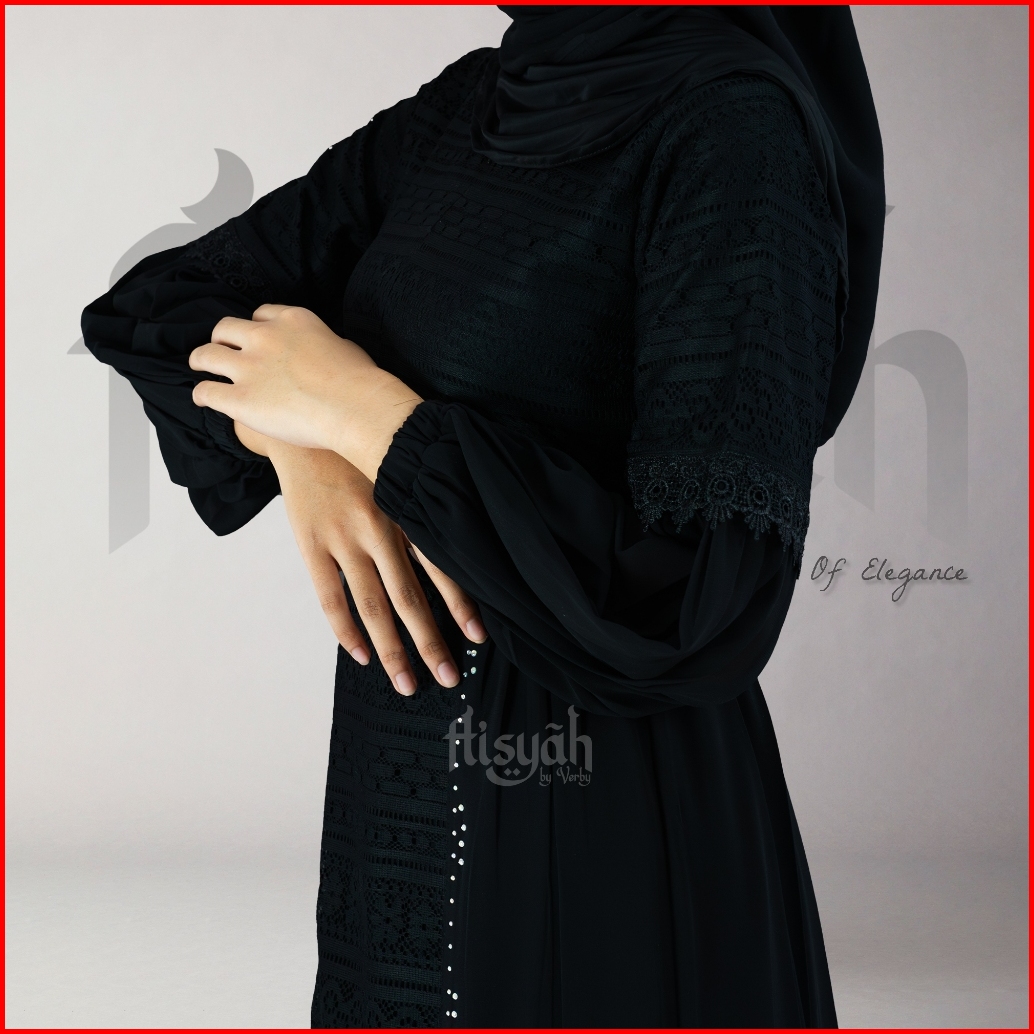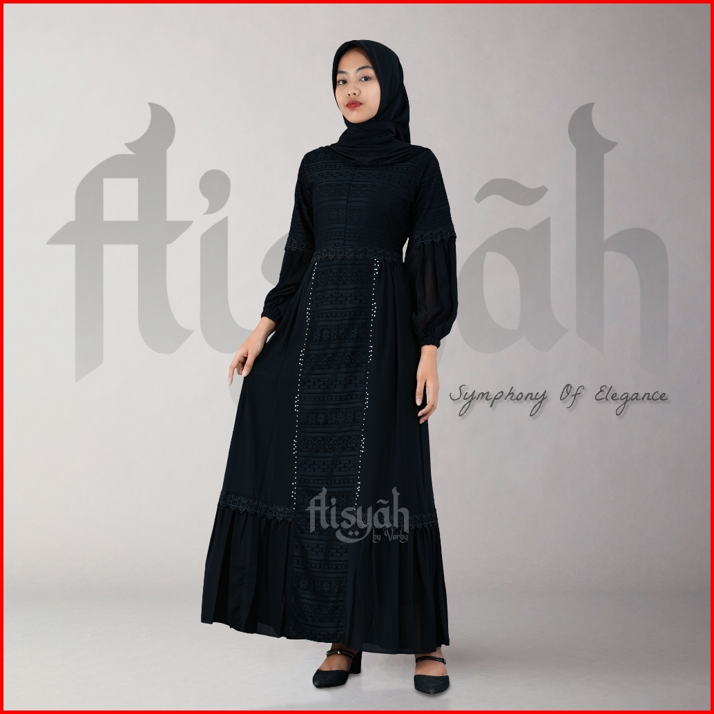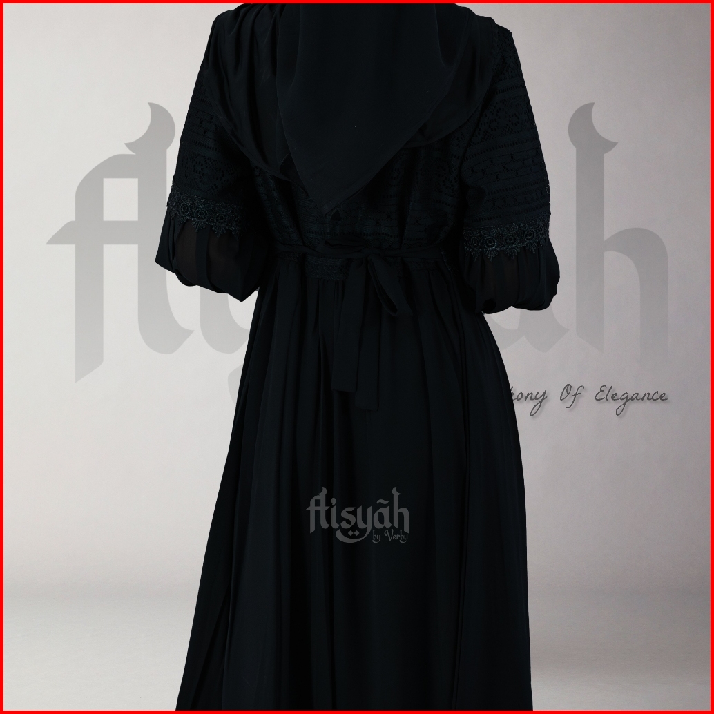 Aisyah057h Gamis Brukat Hitam Wanita Dewasa Busui Wudhu Friendly Simple Dan Elegan Pakai Tali Pinggng - Dress Tile Bokat