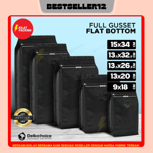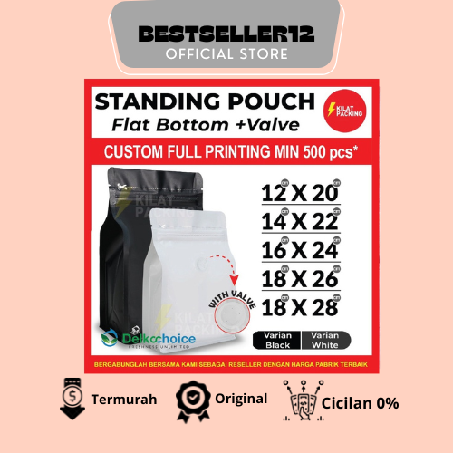 STANDING POUCH FLAT BOTTOM ZIPLOCK ALUMUNIUM FOIL + VALVE KEMASAN KOPI DELKOCHOICE/50 pcs