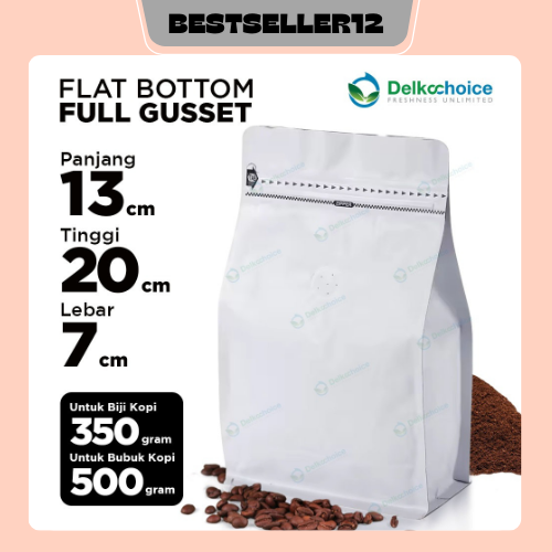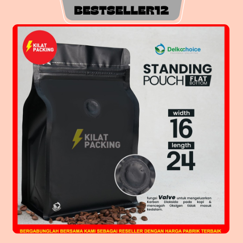 STANDING POUCH FLAT BOTTOM ZIPLOCK ALUMUNIUM FOIL + VALVE KEMASAN KOPI DELKOCHOICE/50 PCS