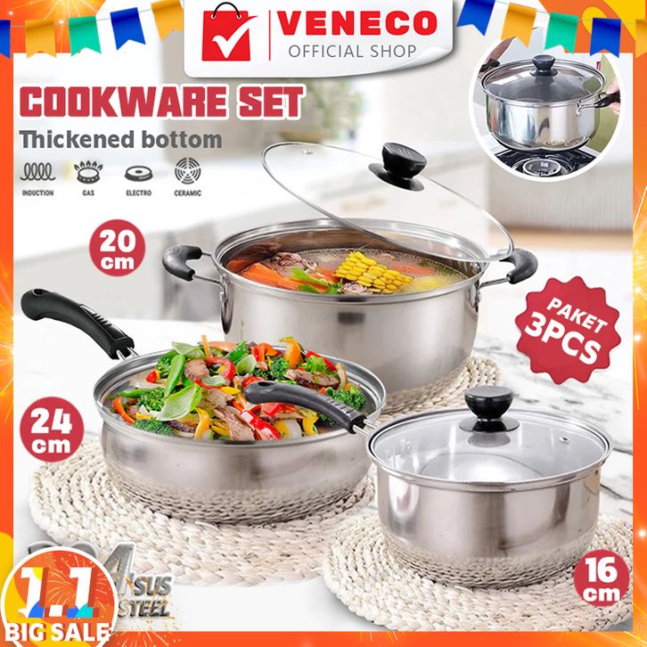 PANCI STAINLESS STEEL 3 Set Panci dan Wajan Stainless Steel / Panci Sup 20cm Panci Mie 18cm Wajan 24cm