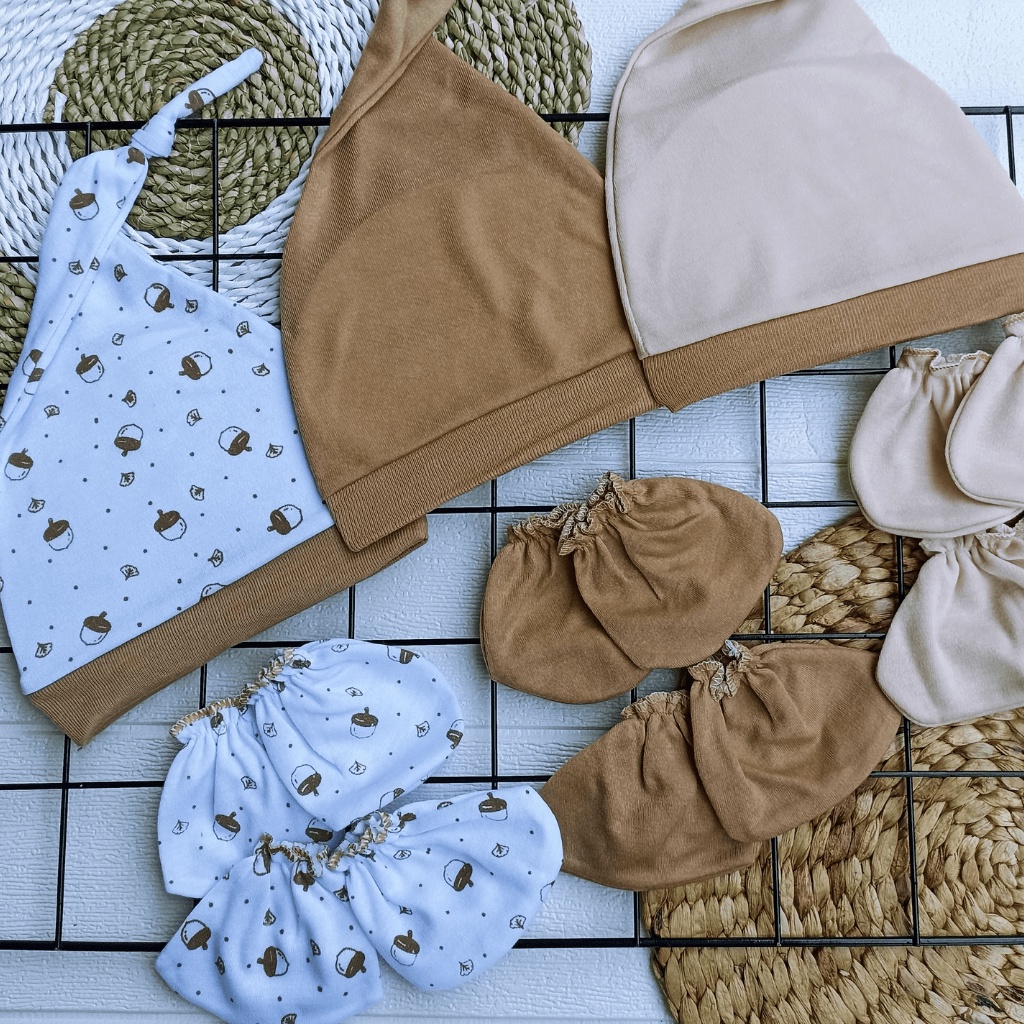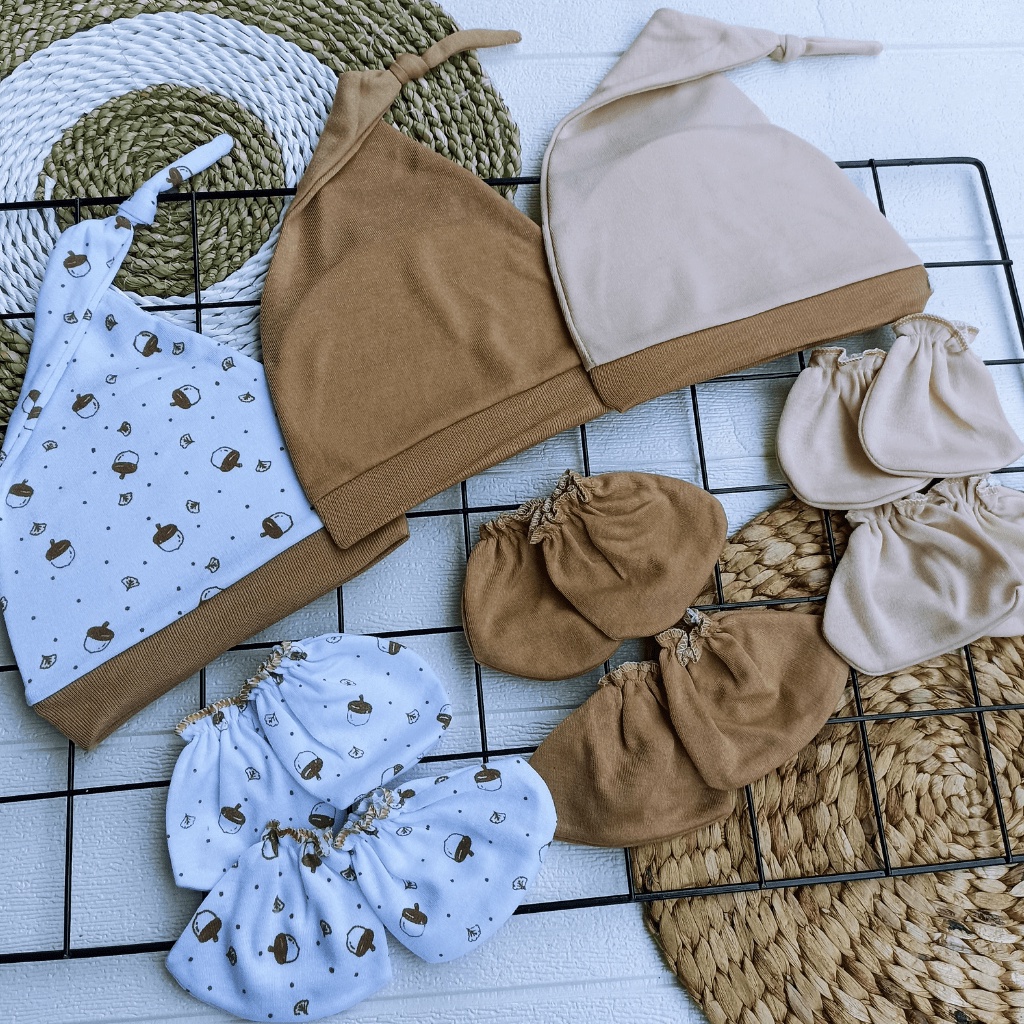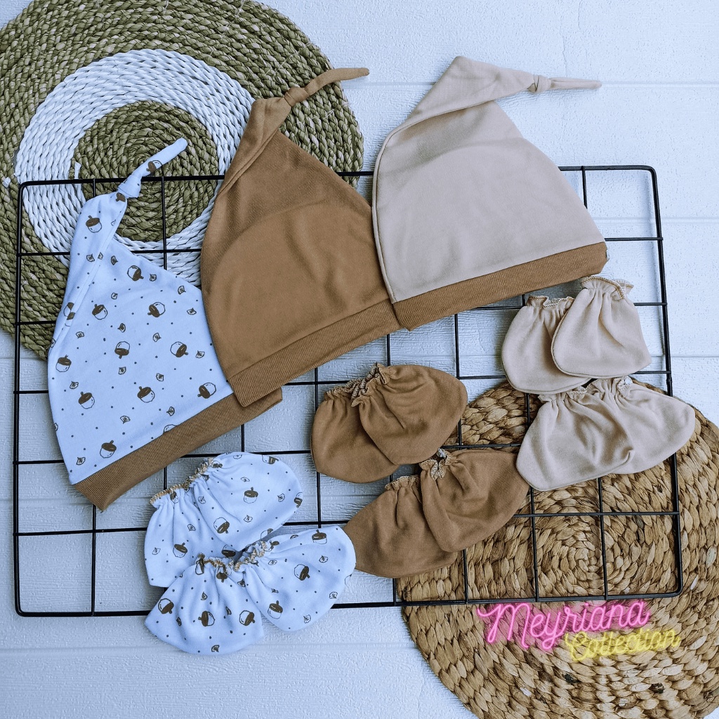 SERI COKLAT - 3 PCS TOPI BAYI BARU LAHIR 3 PASANG SARUNG TANGAN BAYI 3 PASANG SARUNG KAKI BAYI USIA 0-3 BULAN MEYRIANA COLLECTION