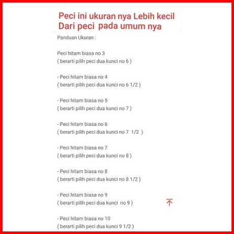 NO 6 SEPERTI NO 3, NO 6 1/2 SEPERTI NO4, NO 7 SEPERTI NO 5, NO 7 1/2 SEPERTI NO6, NO 8 SEPERTI NO 7, NO 8 1/2 SEPERTI NO8, NO 9 SEPERTI NO 9, NO 91/2 SEPERTINO 10, NO 10 SEPERTI NO 11
