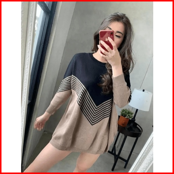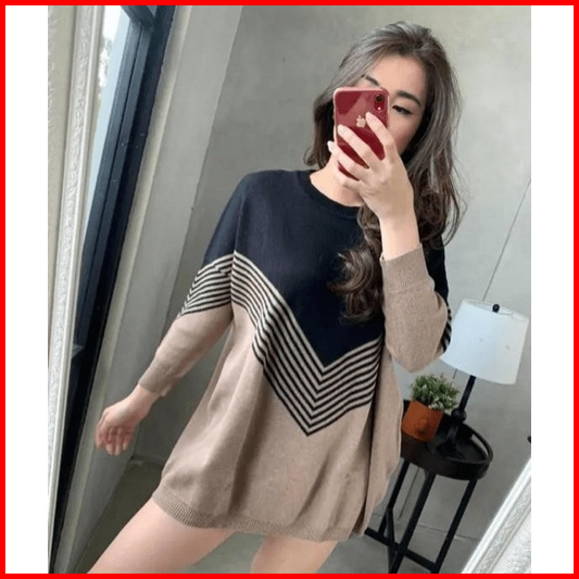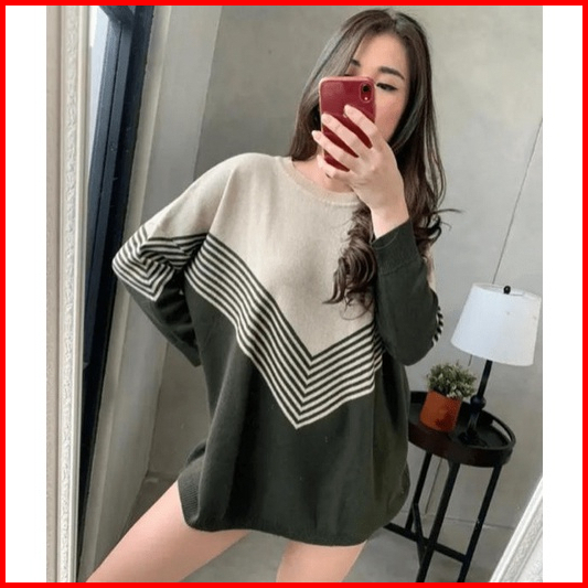 Elzaco Bara Rajut Oversize - Baju Atasan Wanita Bahan Rajut Premium Tebal Motif Stripe - Sweater Terbaru