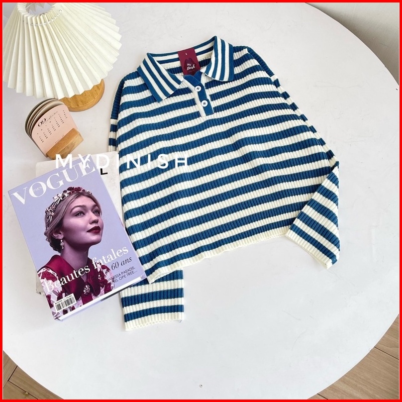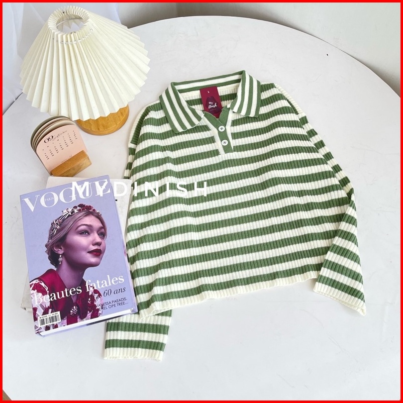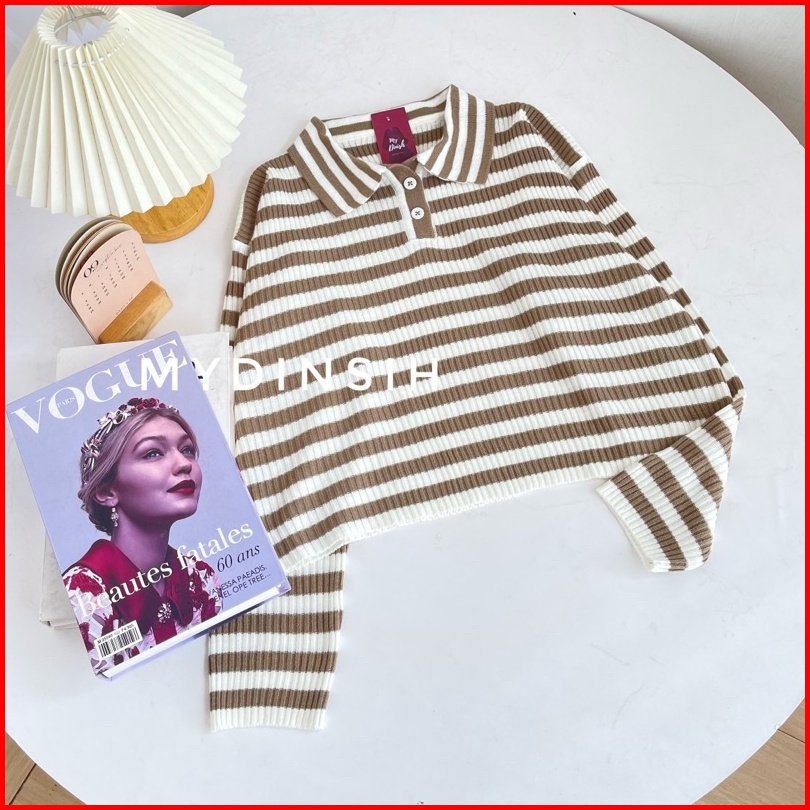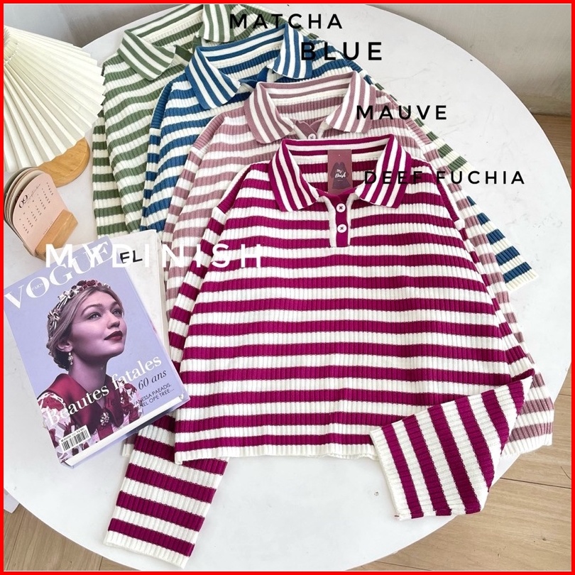 Freya Crop Blouse - Atasan Blouse Wanita Berkerah Polo Motif Stripe