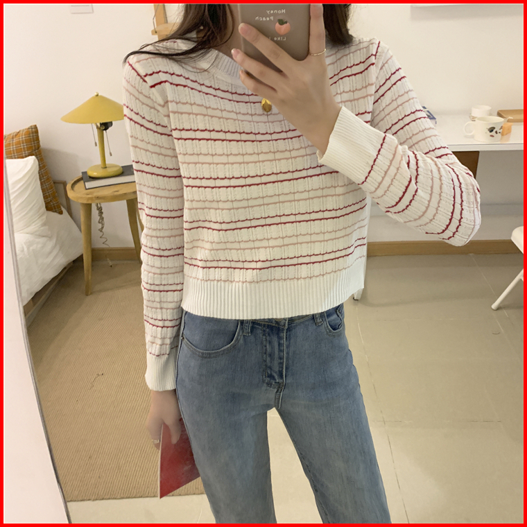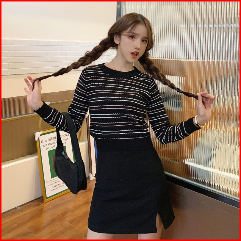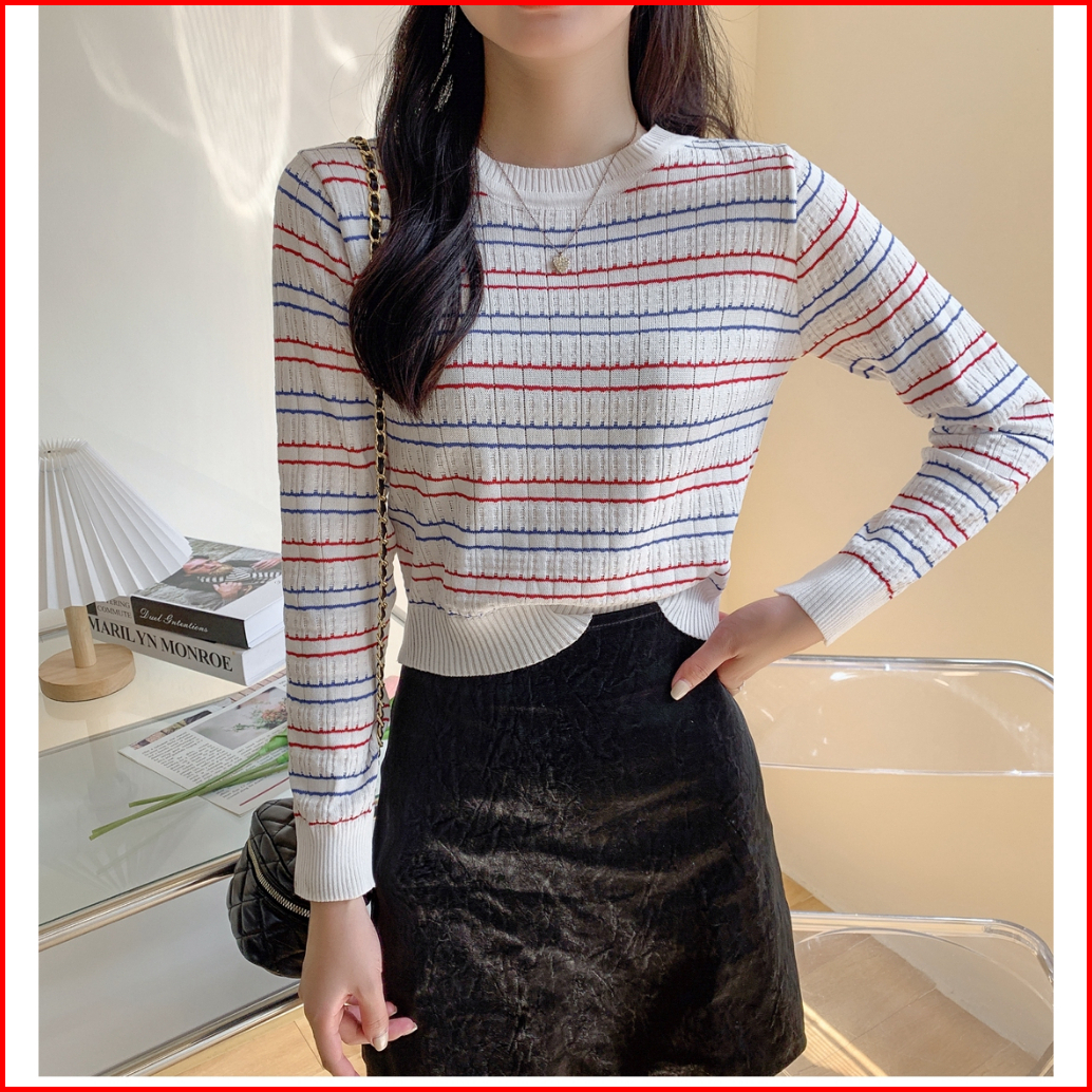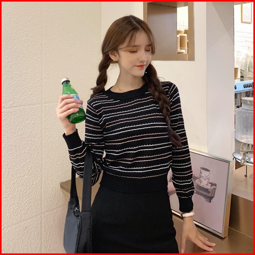Rajut Knit Wanita Korea Style Stripe Crop Top Lengan Panjang Vintage Rajut Premium Baju Atasan Wanita