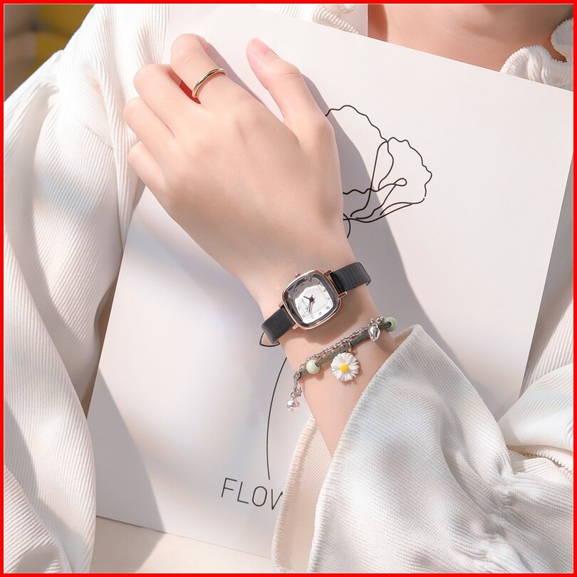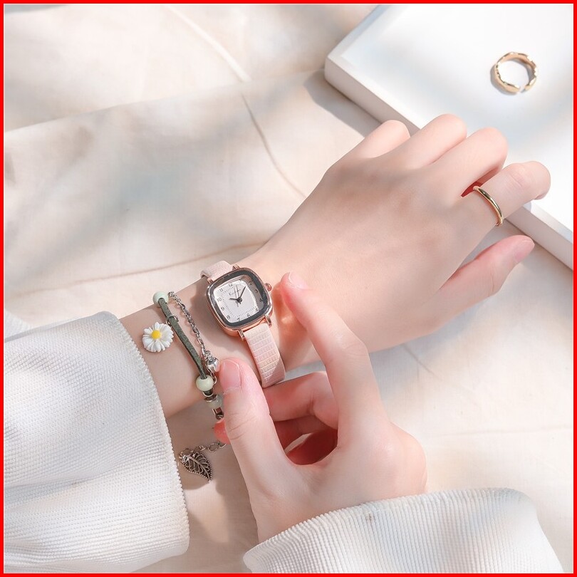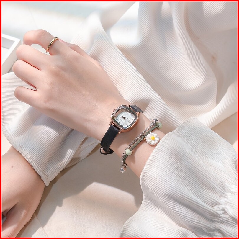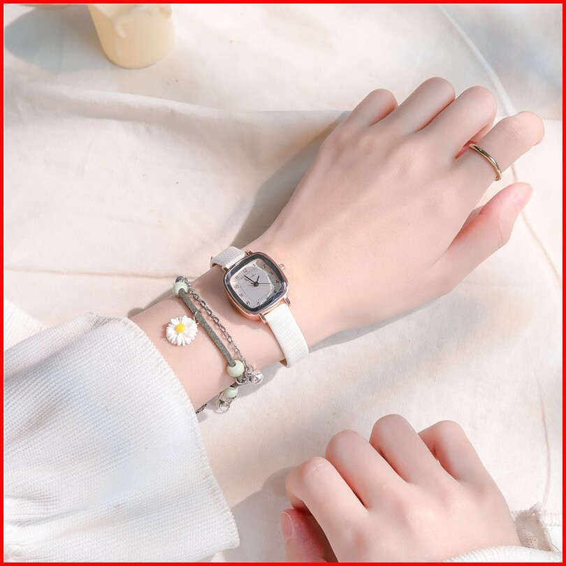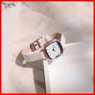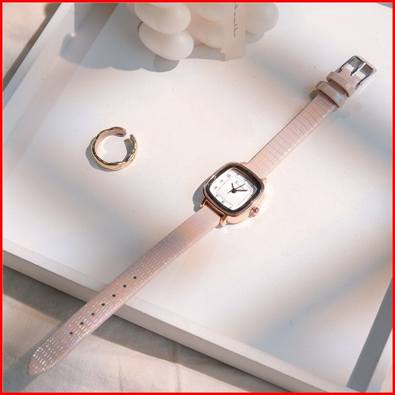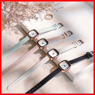 Jam Tangan Wanita Tali Kulit Pastel Pink White Black Square Color Warna Hitam Putih Tahan Karat Air Watch Analog Koutake