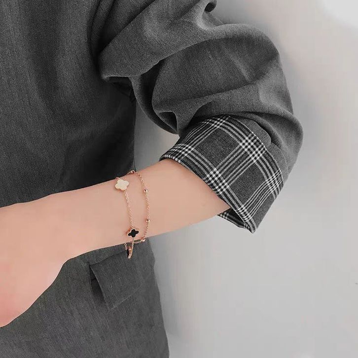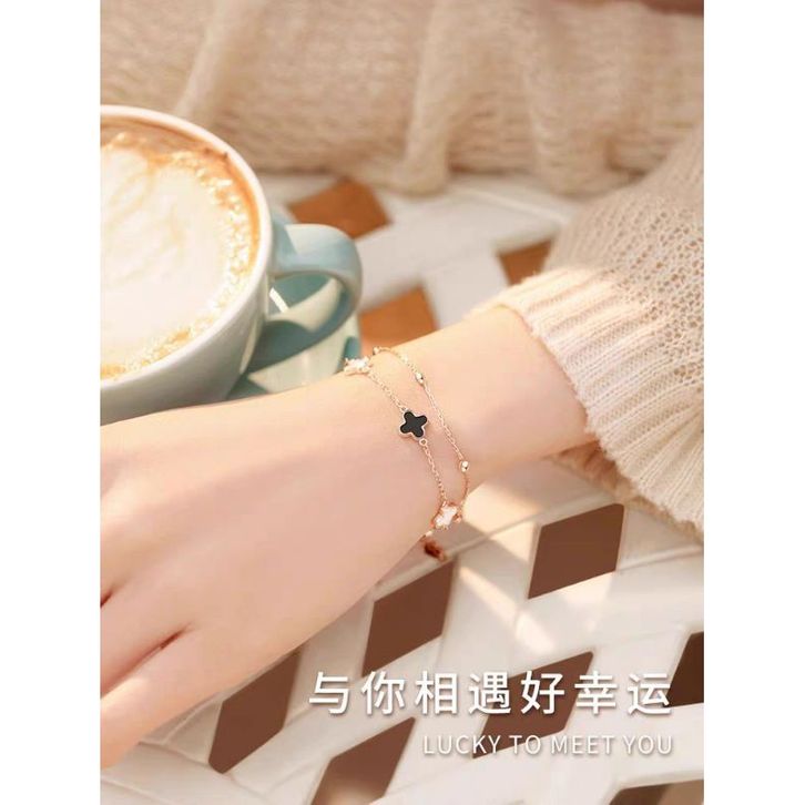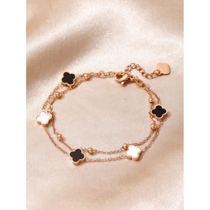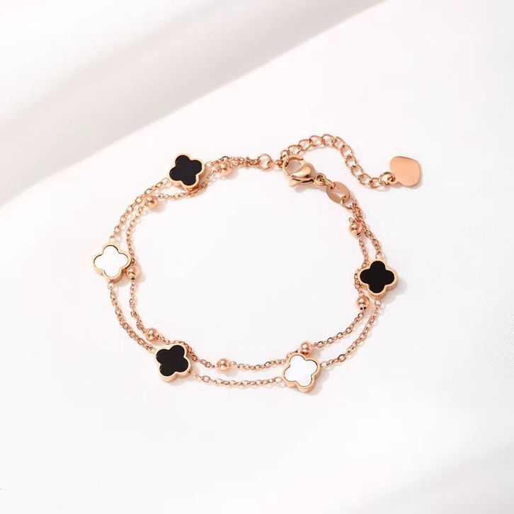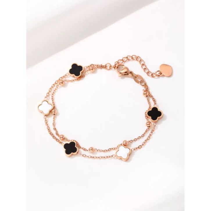 Gelang Titanium Wanita Rantai Clover Hitam 2Layer Hitam Putih Kecil Terbaru Gelang Anti Karat